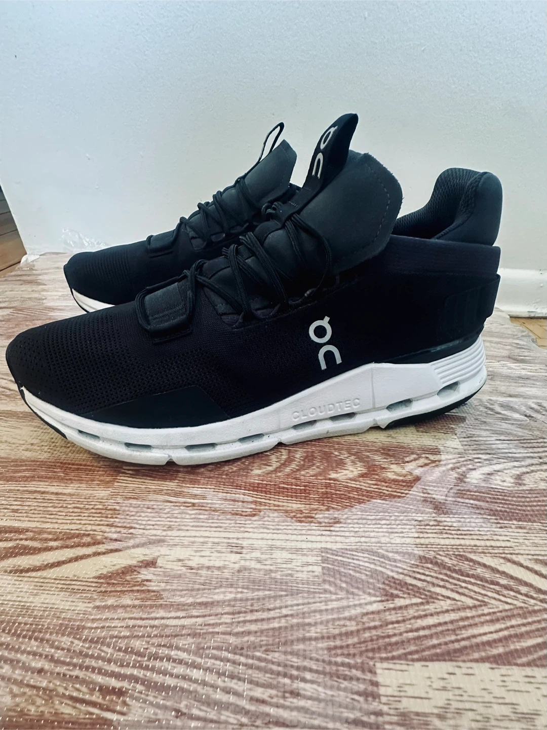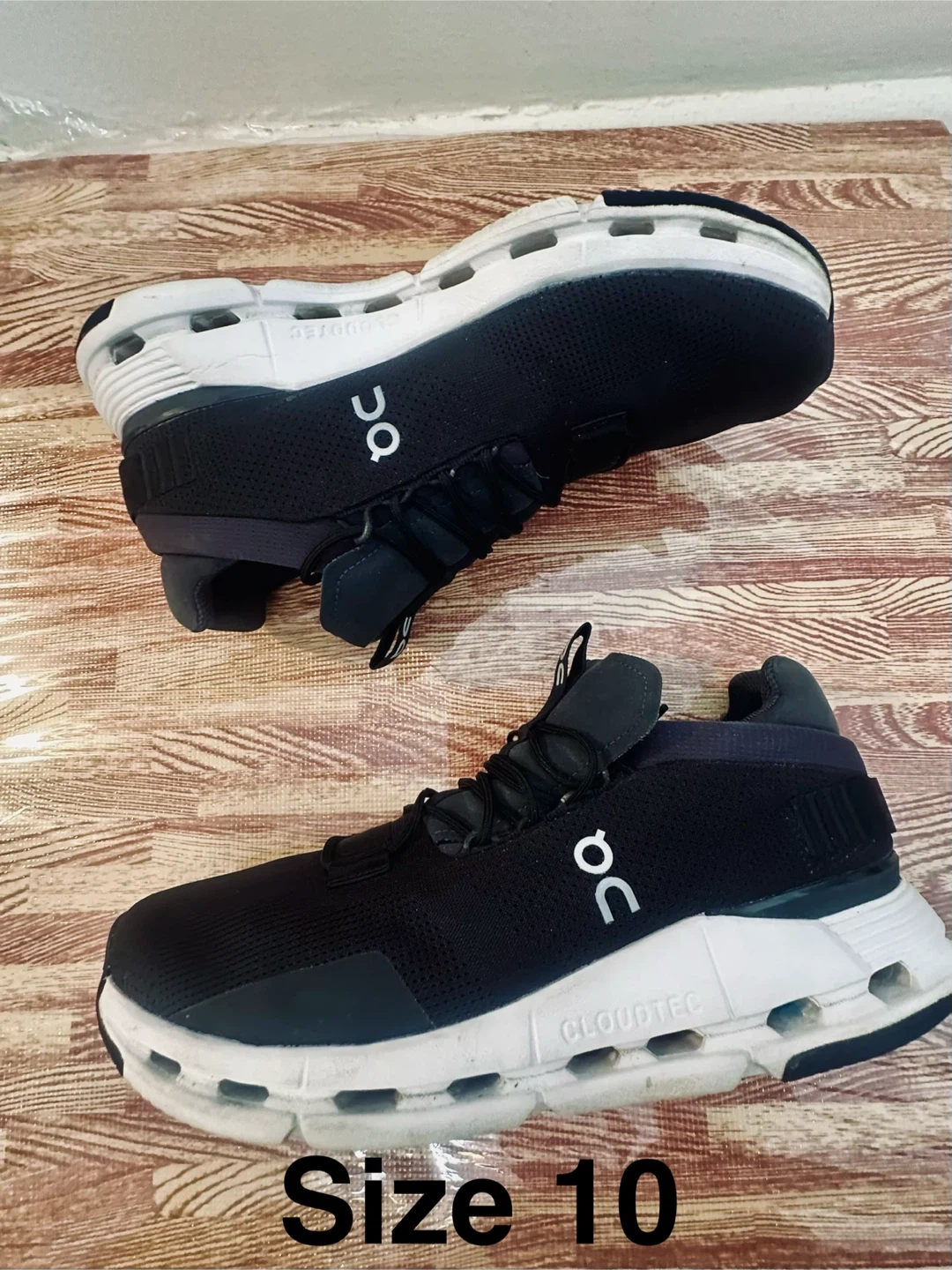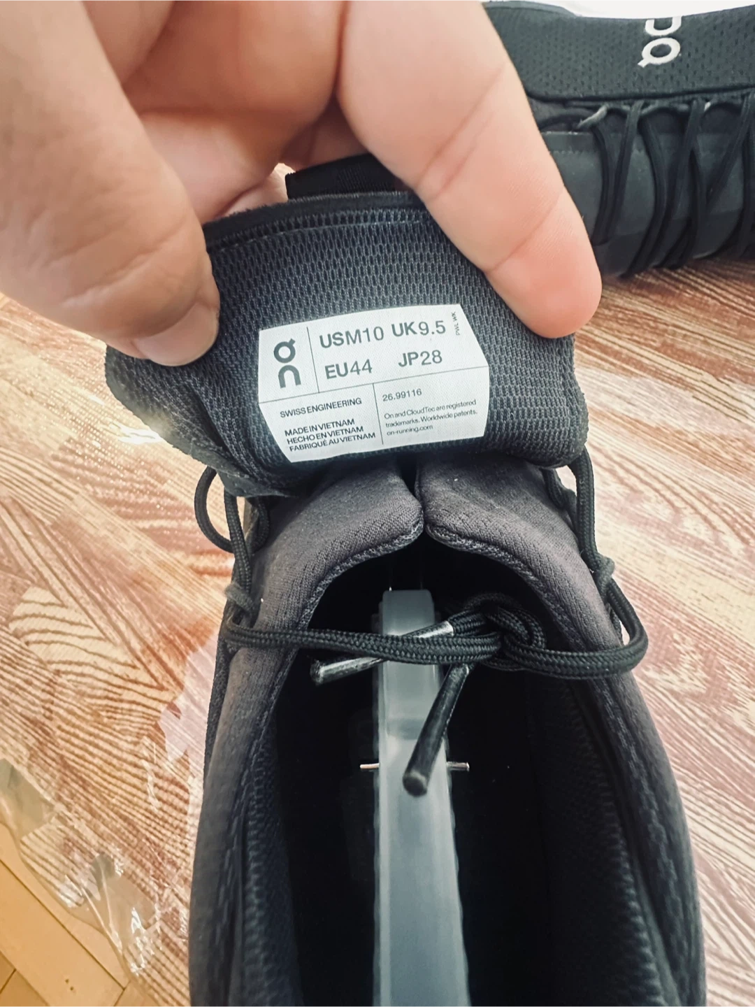 These are black On CloudTec running shoes. They're a men's size 10 US, EU 44, UK 9.5, JP 28. The shoes are made in Vietnam.