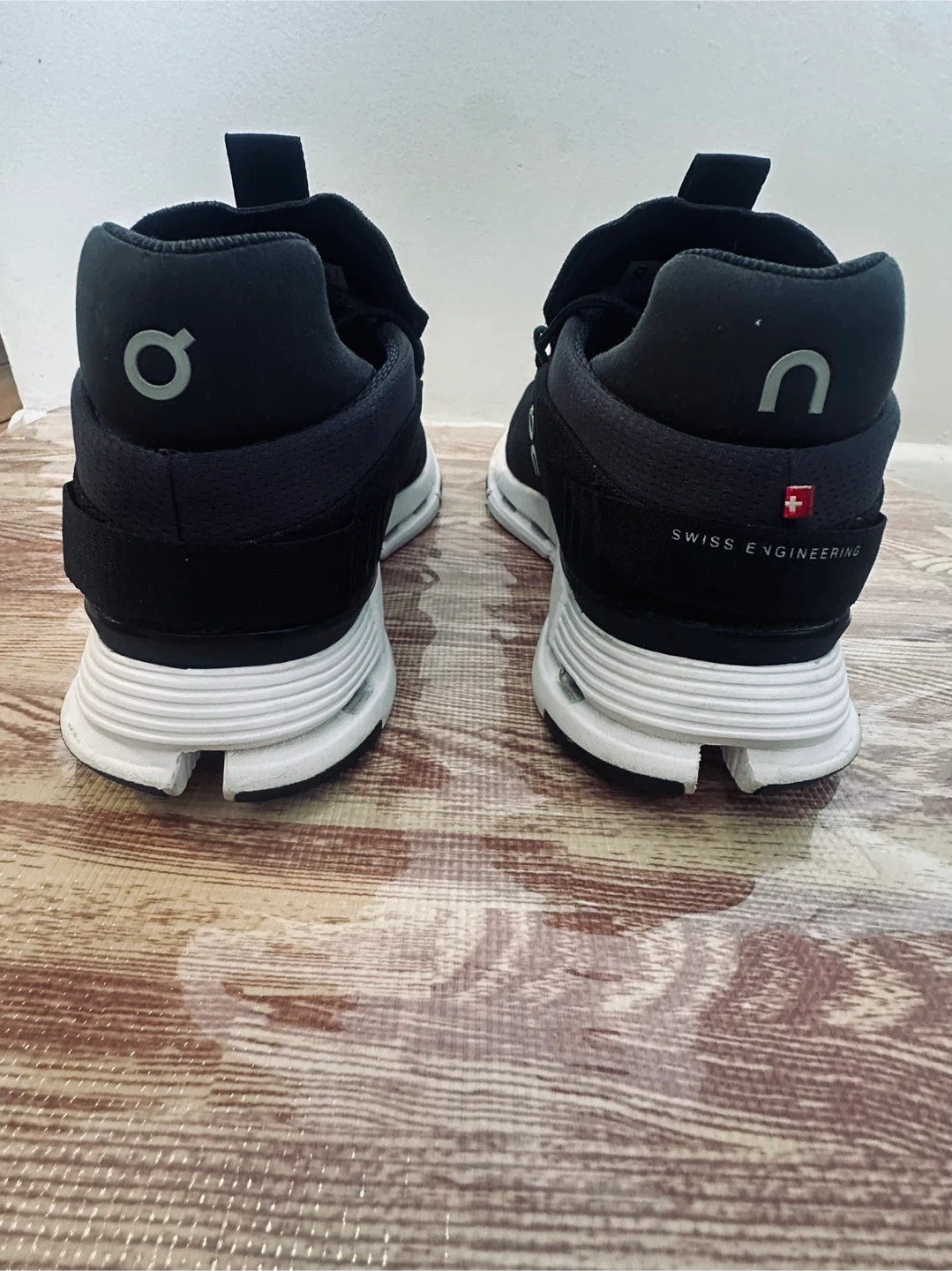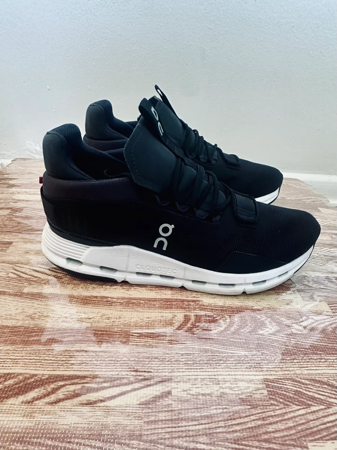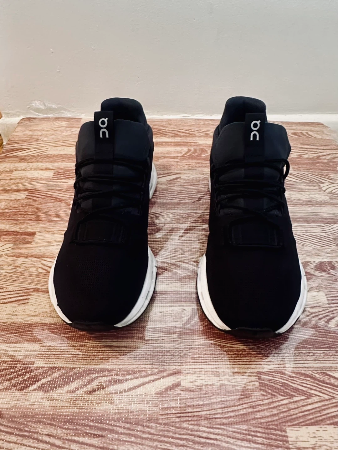 These are black On CloudTec running shoes. They're a men's size 10 US, EU 44, UK 9.5, JP 28. The shoes are made in Vietnam.