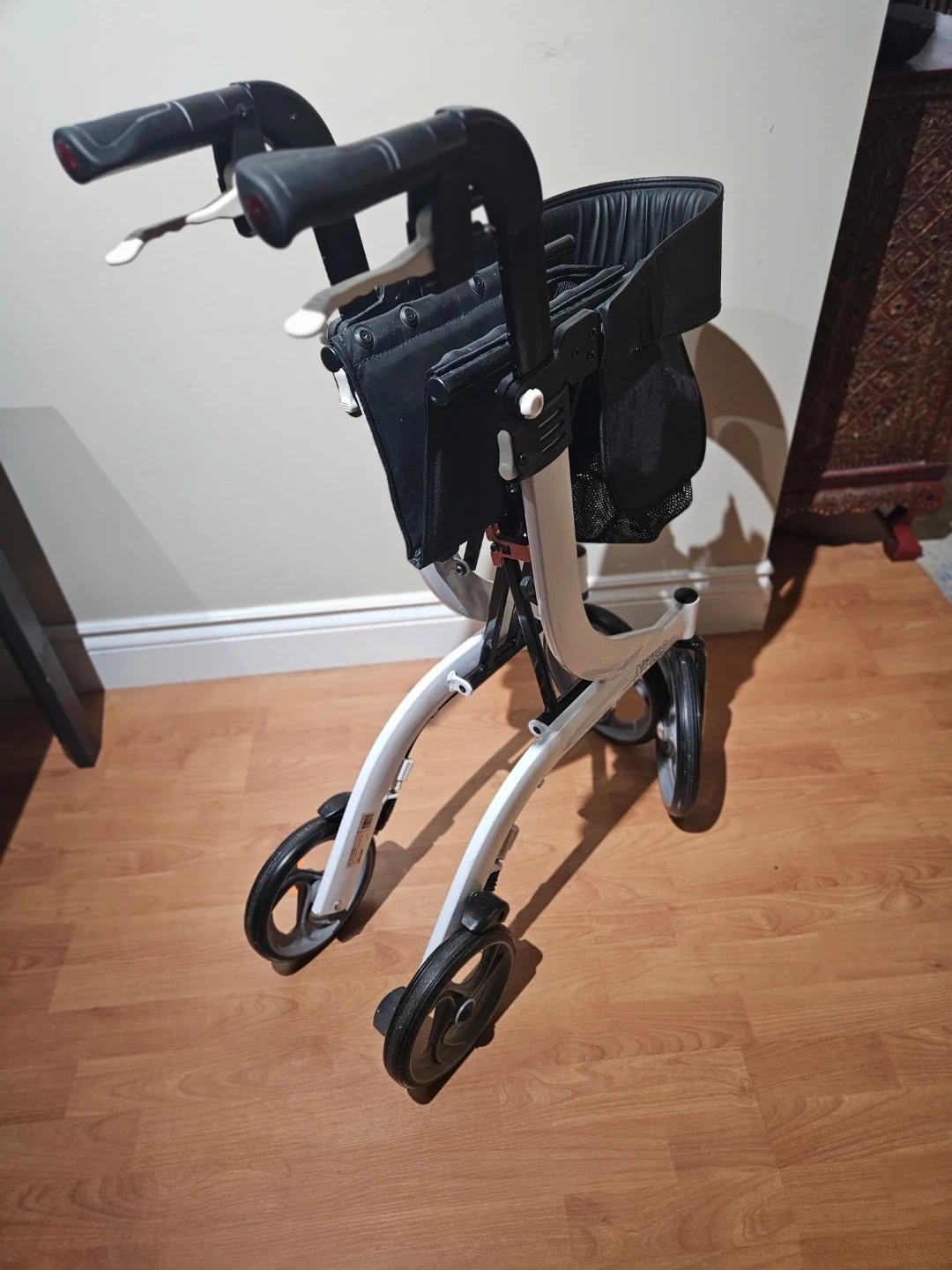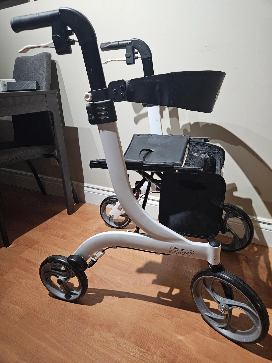 This white Drive Nitro rollator walker is a great mobility aid. It comes with a black seat and storage basket. Its lightweight design makes it easy to manoeuvre indoors and outdoors.