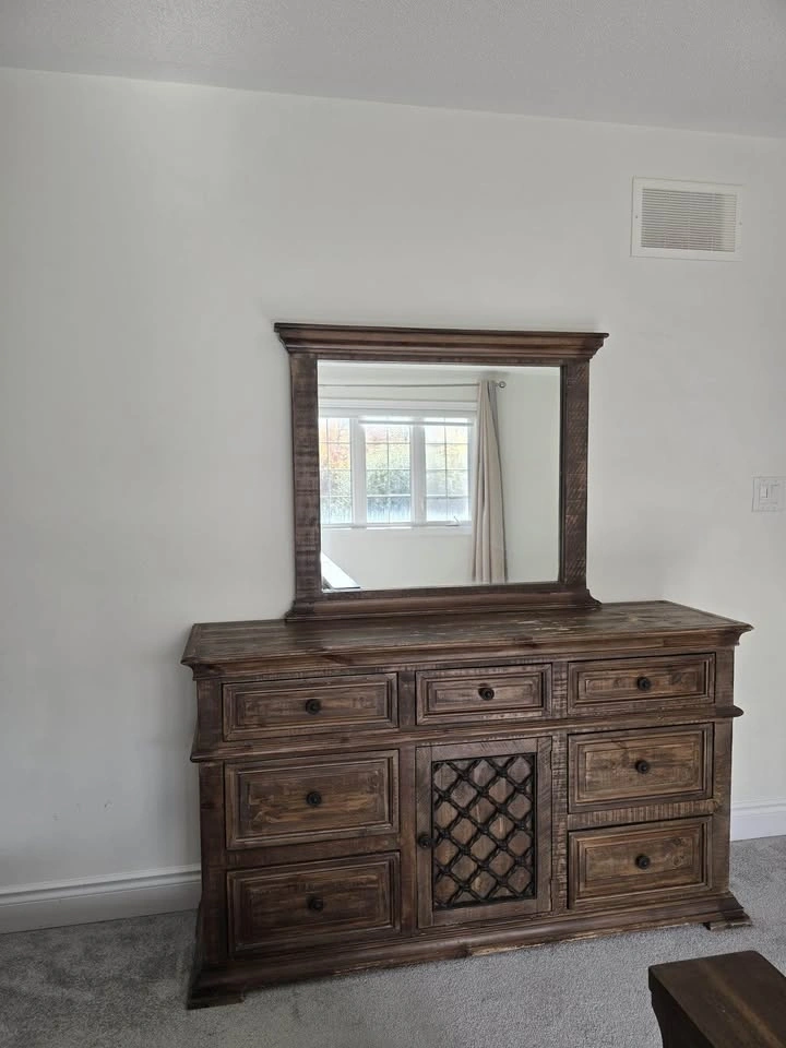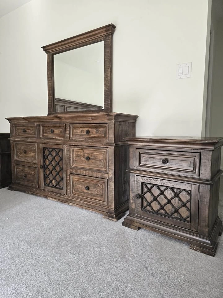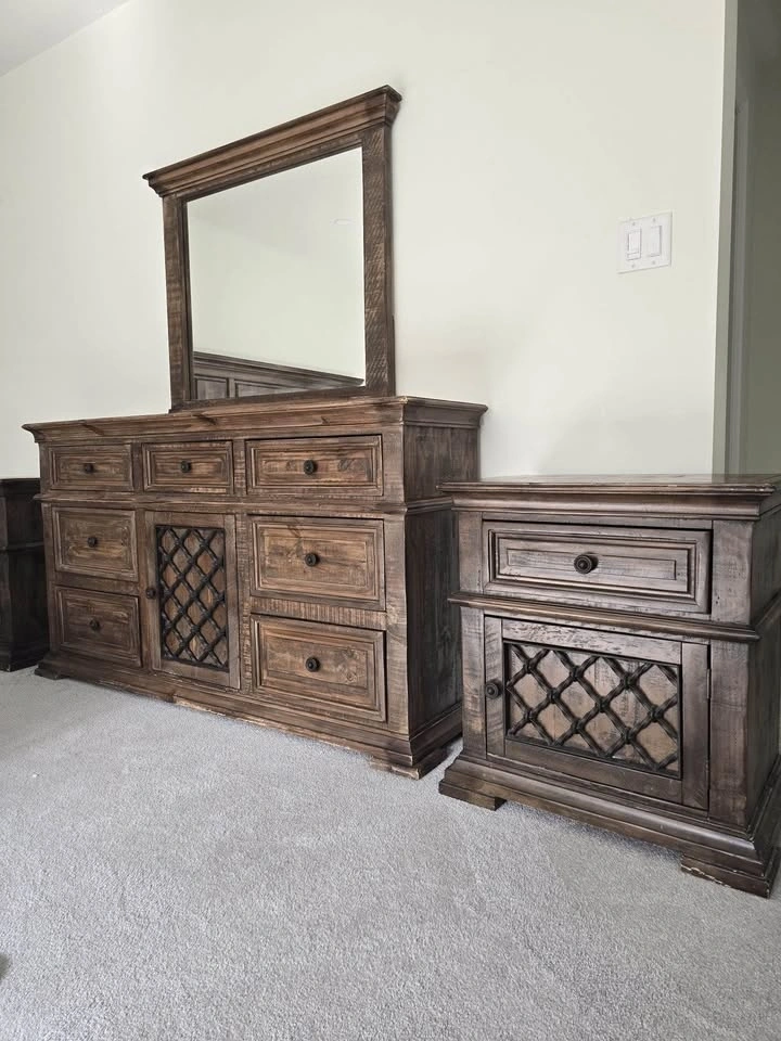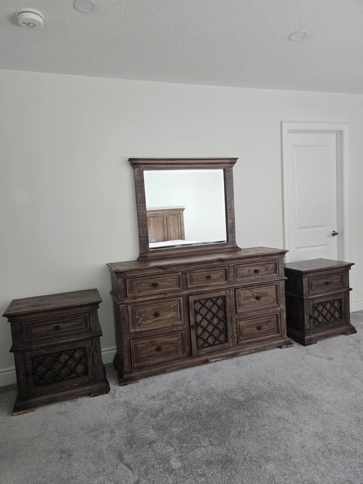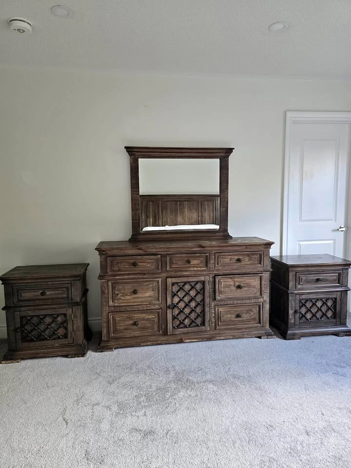 Clean, high-quality bedroom set in great condition. Includes: Large dresser with mirror, 2 matching nightstands. Dresser without mirror 60βx35βx15β. Mirror: 38βx34β. Nightstands 24βx27βx15β (LxHxW). Rich dark wood finish with detailed craftsmanship β sturdy, not cheap MDF. Plenty of storage and built to last. Gently used, no major damage. $350 (open to reasonable offers). Pickup: Mayfield and McLaughlin.