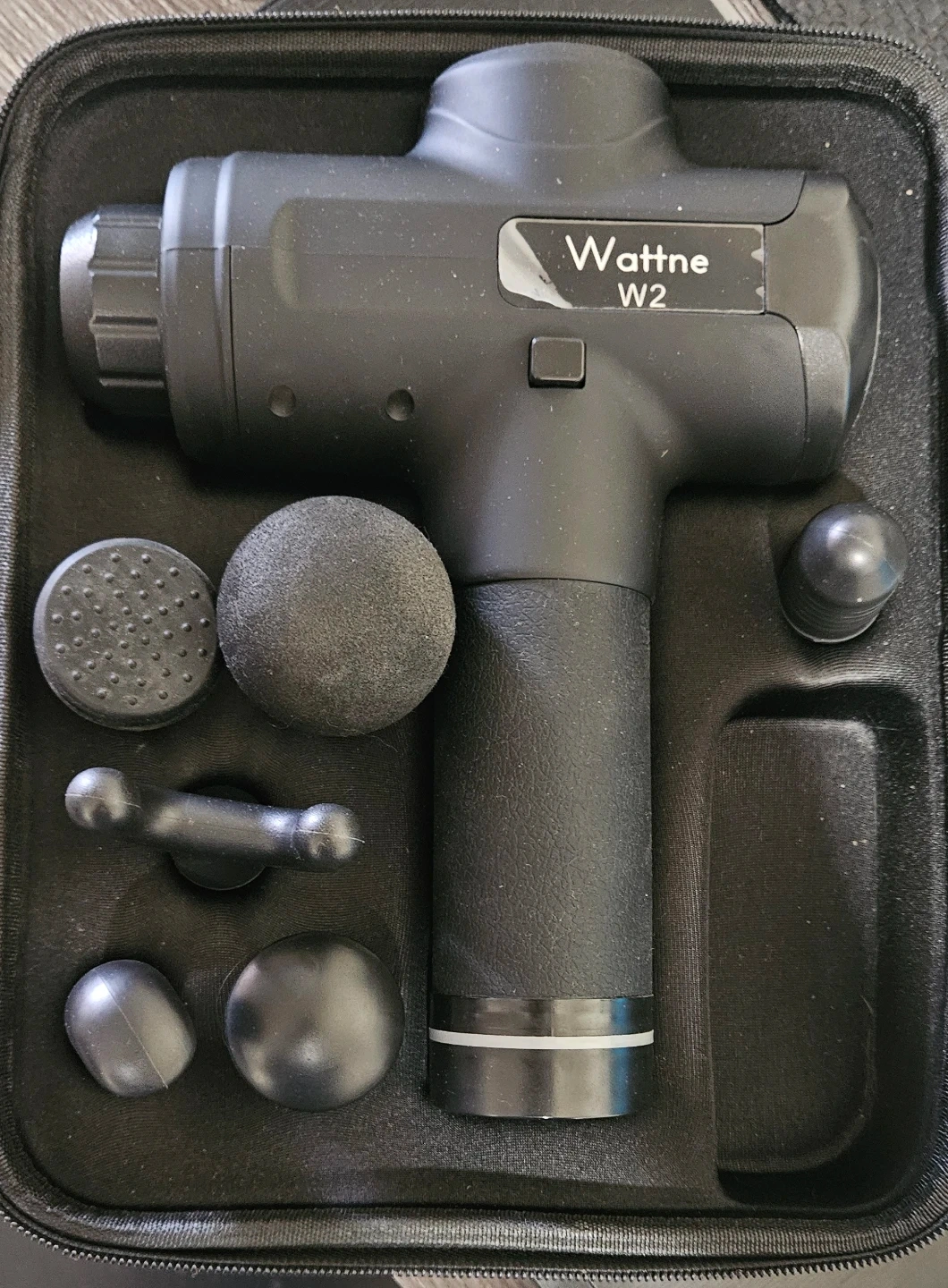 This Wattne W2 massage gun comes with five different massage head attachments for various muscle groups. It's stored in its original black carrying case. It's great for post-workout recovery.