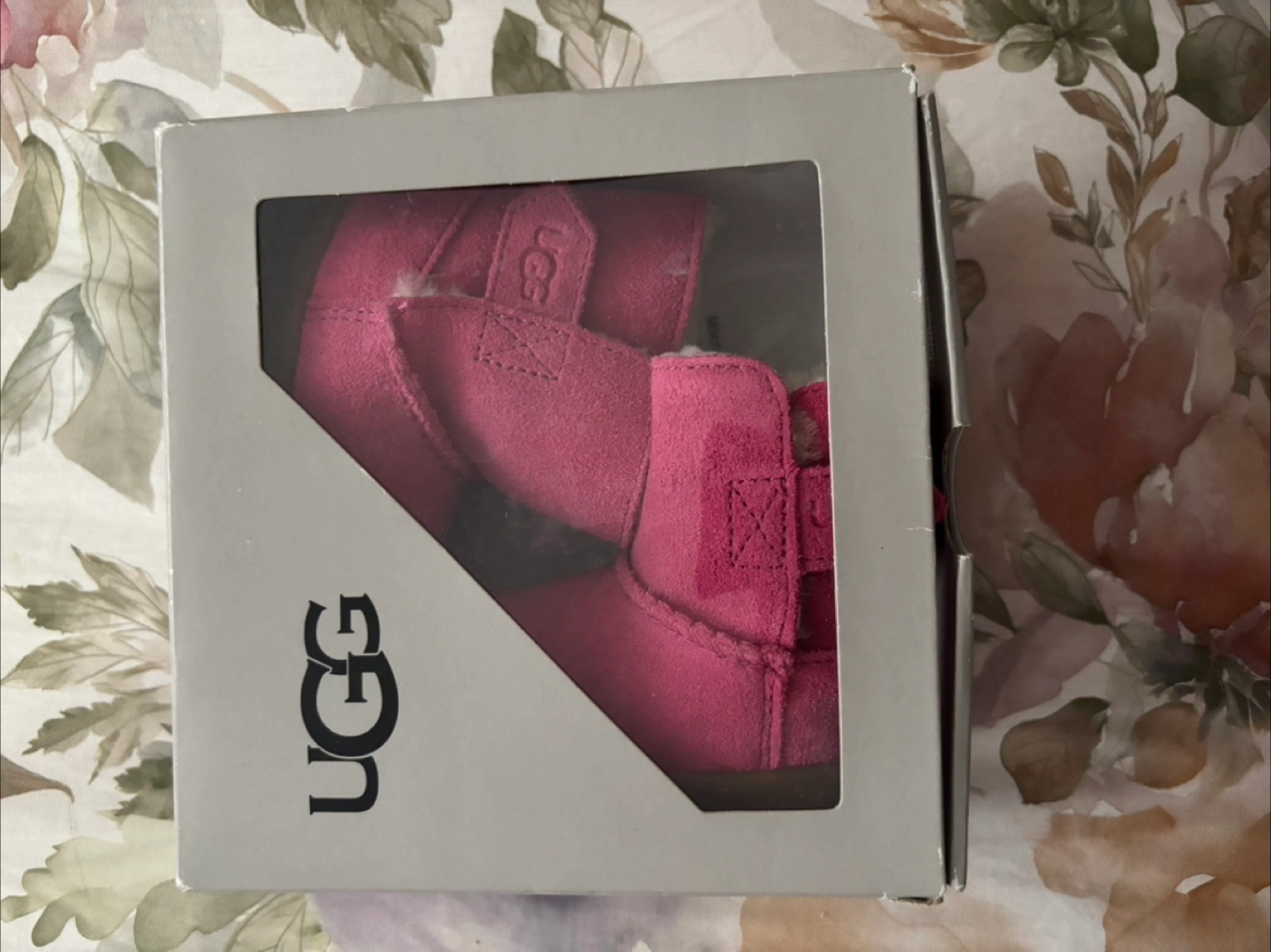 Here is a lovely pair of pink UGG boots still in the original box. The boots are pink with a brown sole. They feature a velcro strap closure. These boots would be perfect as a gift to a special little one.