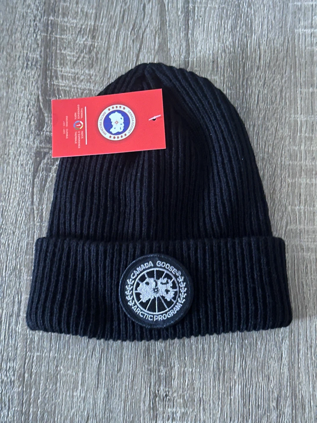 This is a black ribbed beanie hat from Canada Goose. Rib-knit wool beanie. Embroidered logo patch at rolled brim. It's made with a cozy knit material. The hat comes with its original tags and packaging.