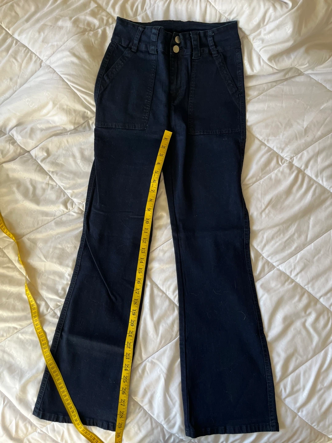 These brand new dark wash jeans are a size small. They're made from a blend of 75% cotton, 23% polyester, and 2% spandex. These flare-leg pants are perfect for a stylish, casual look.