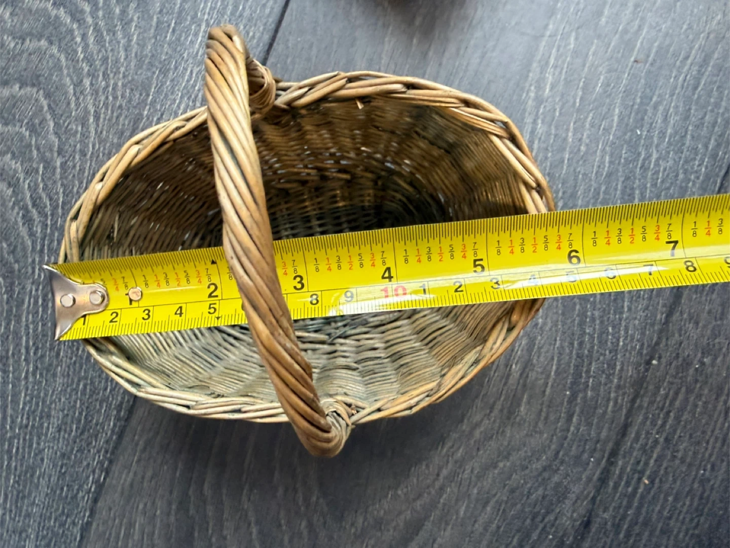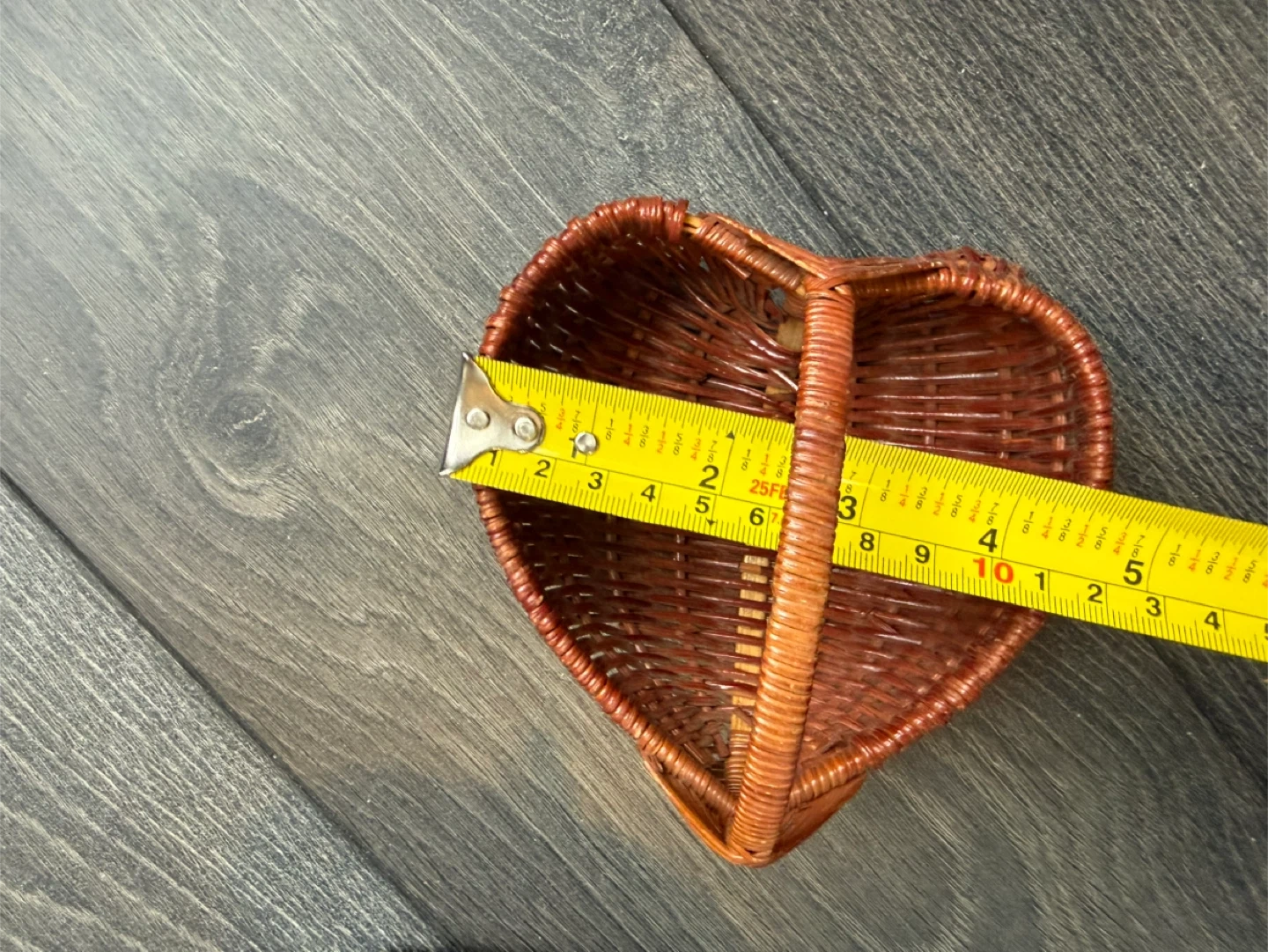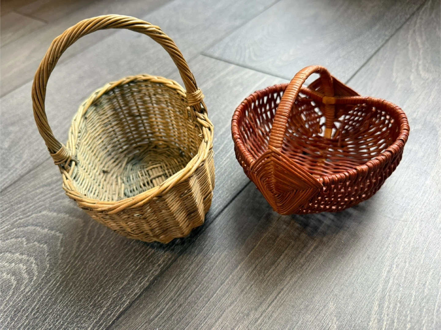 Perfect for Easter! This is a set of two small wicker baskets. One is a natural tan colour and oval shaped, measuring approximately 6 inches long and 4 inches wide. The other is a reddish-brown heart-shaped basket, measuring approximately 5 inches wide and 5 inches long. Both have handles and are made from woven natural materials. They're great for small decorations or organizing trinkets!