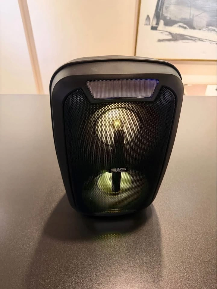 Powerful bass + LED party lights. Comes with microphone and remote control.