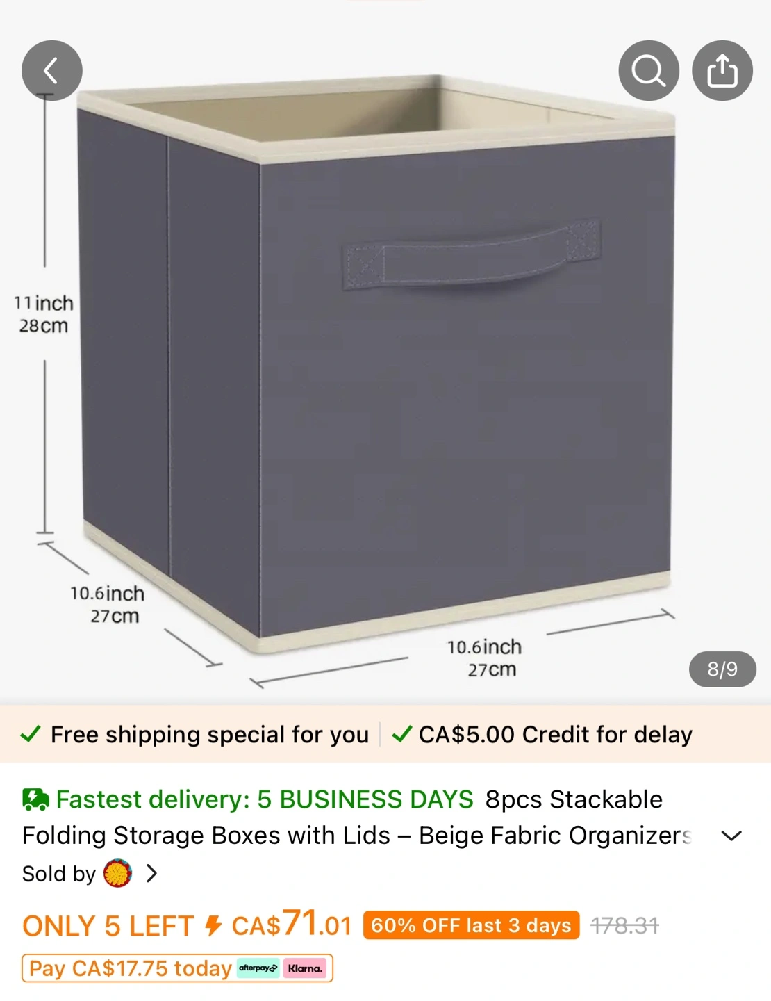 Eight beige fabric storage boxes. Stackable design. Includes lids. Great for organizing closets or shelves.