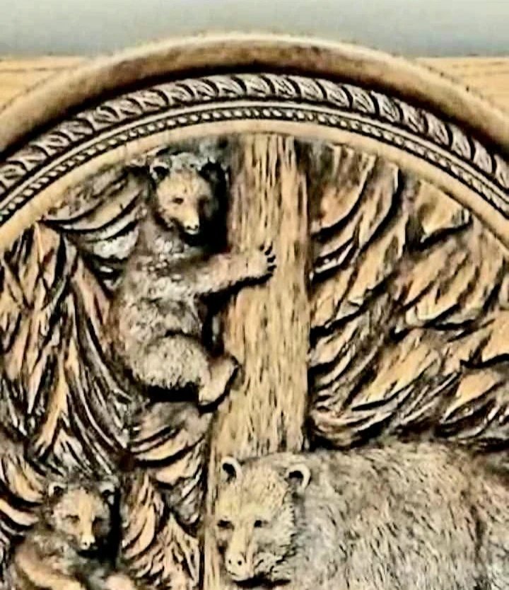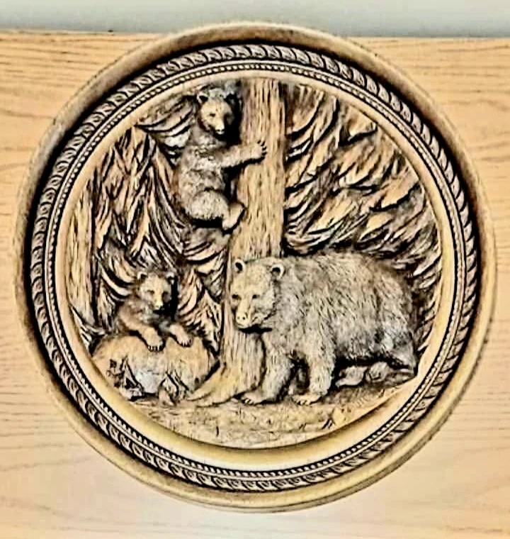 Rare 1970s Original,Authentic Karl Rothammer wooden sculpture featuring a bear and cubs in a detailed, round, rope-bordered design. This vintage piece, produced in ON Canada by Rothammer Wood Art Products Ltd., measures 36 cm in diameter. It's a unique collectible with the original design by sculptor Karl Rothammer, protected under copyright since the early 1970s. This piece is in very good condition.