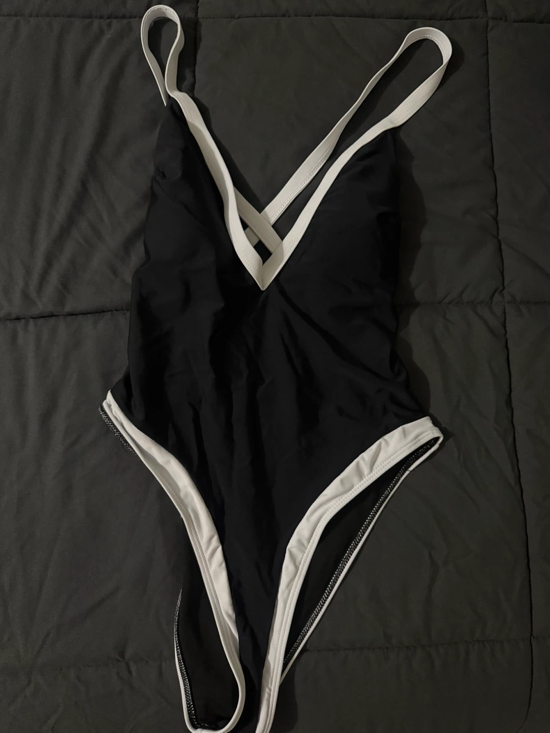 This one-piece swimsuit is black with white trim and features a plunging neckline with criss-cross straps at the back. It's made of a stretchy material for a comfortable fit. Perfect for hitting the beach or pool!