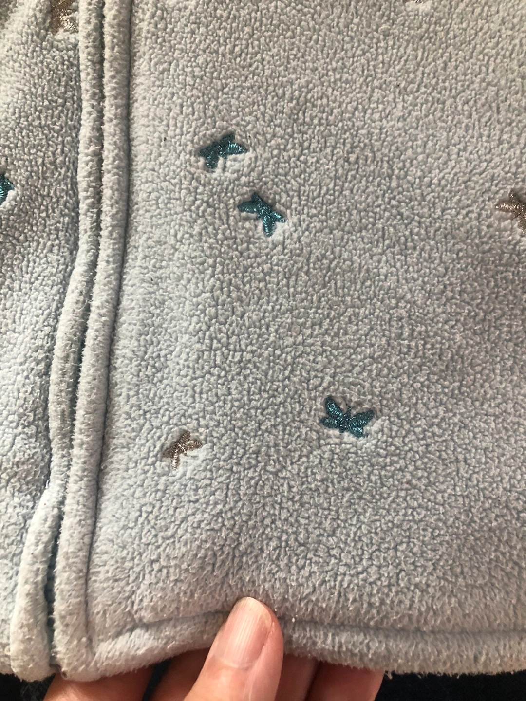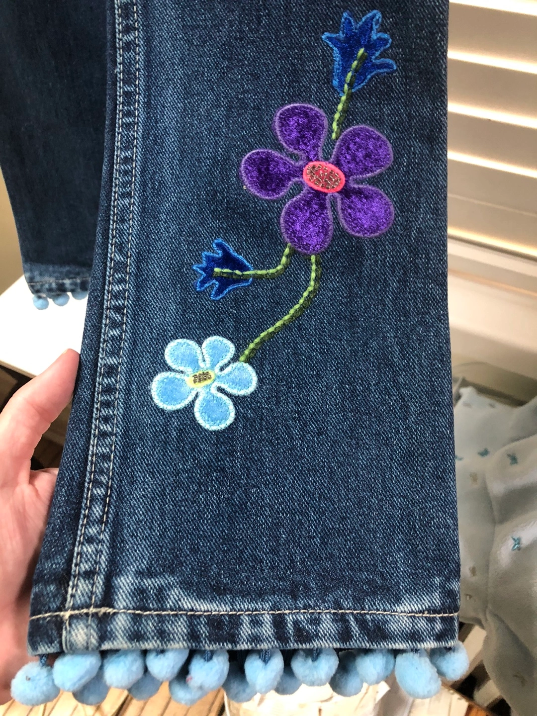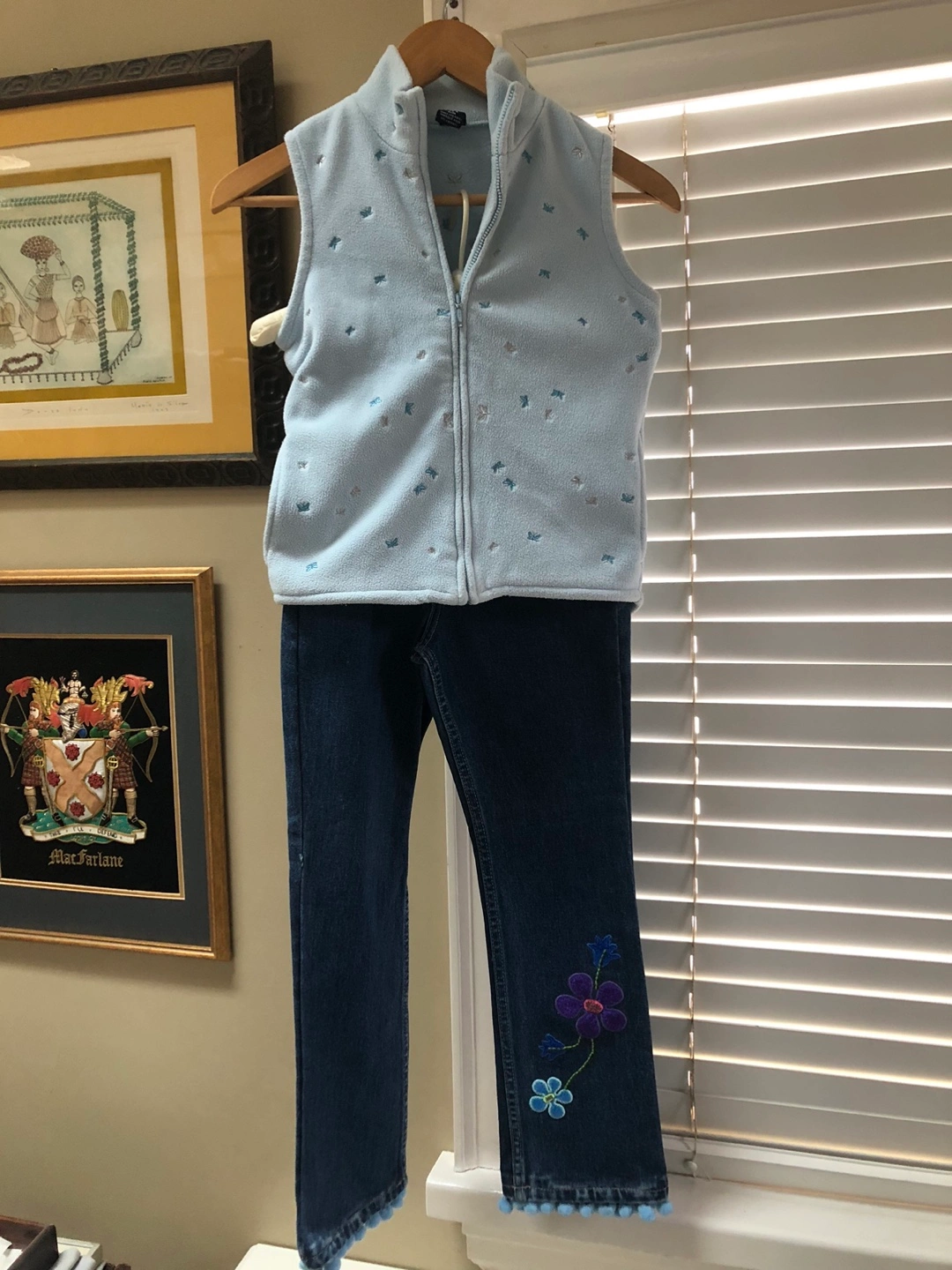 Adorable GAP girls' outfit. Includes a light blue fleece vest with embroidered butterflies and a pair of dark wash jeans with embroidered flowers and pom-poms. Vest is size M/M. Jeans are size 8. Vest has been worn/jeans are NEW with tags. Yonge/Davisville pick up.