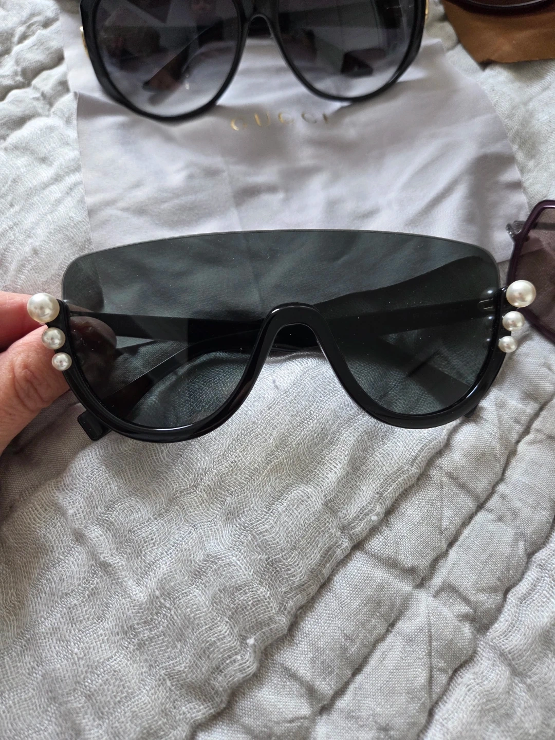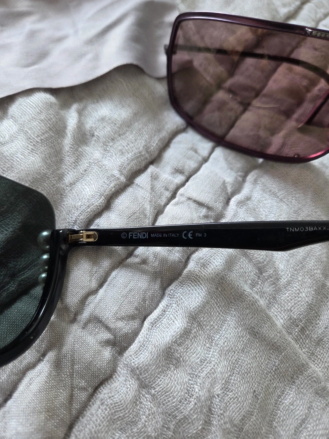 Stylish black Fendi sunglasses with decorative pearl accents on the frame. Made in Italy, these sunglasses feature dark lenses and a bold cat-eye design. Perfect for adding a touch of glamour to any outfit!