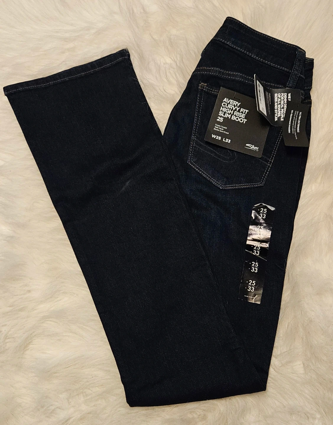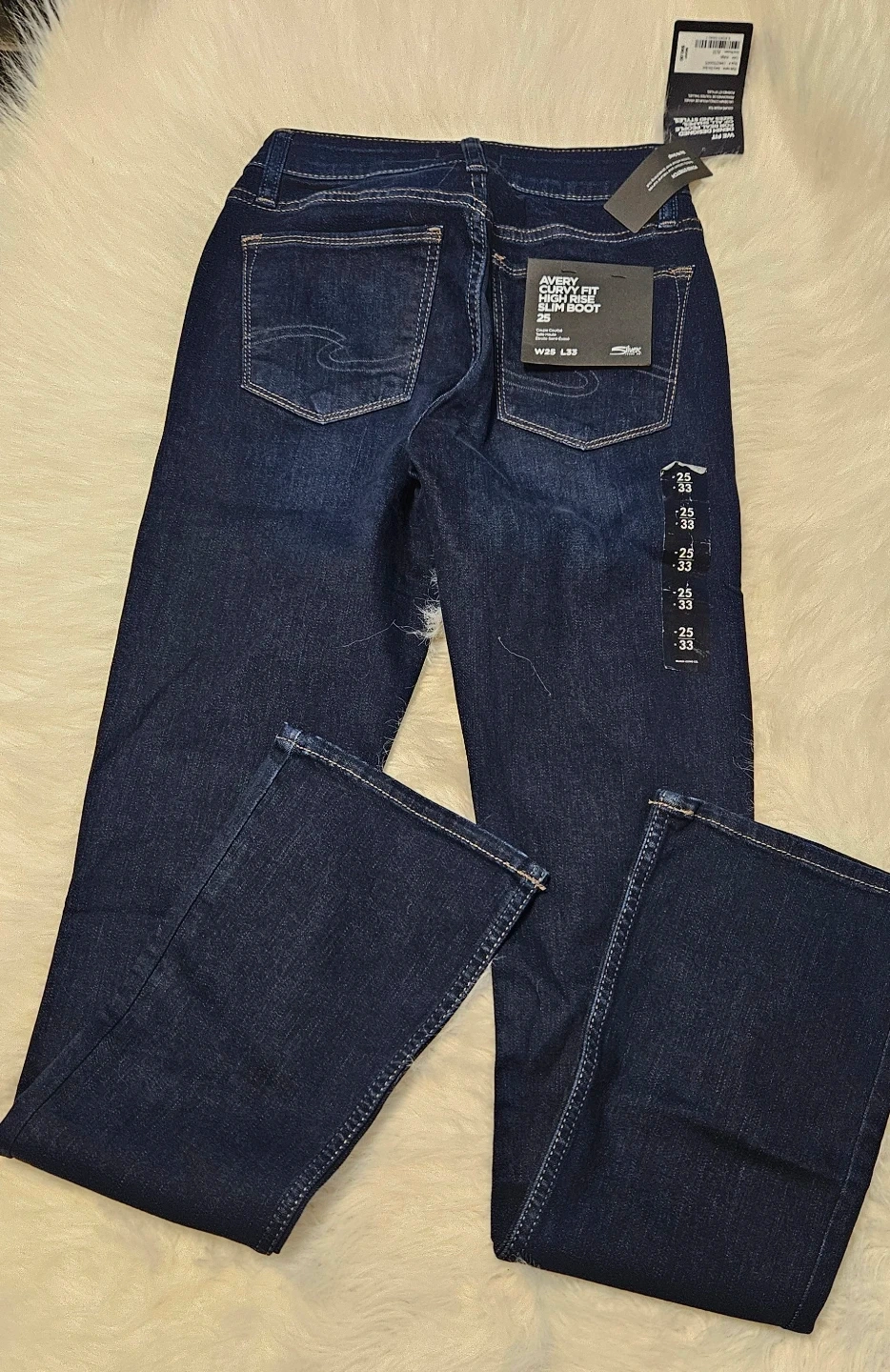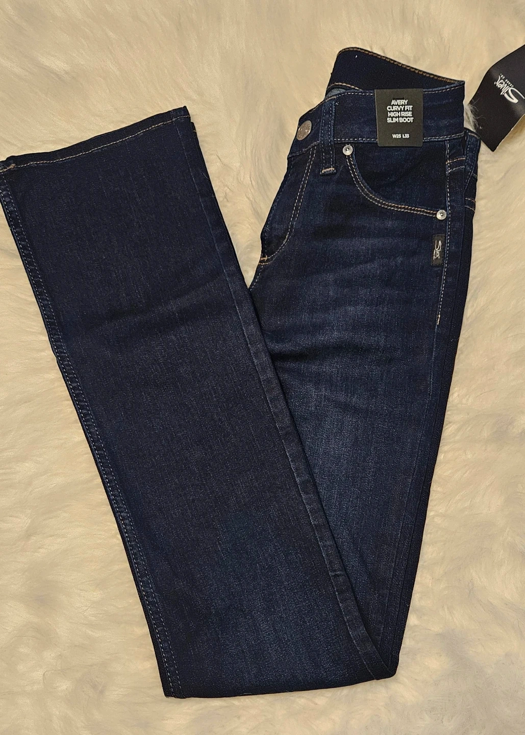 Silver Jeans Co. Women's Avery Curvy Fit high-rise slim bootcut jeans in a dark wash. Size W25 L33. These jeans are made for a flattering fit with a slim leg opening.