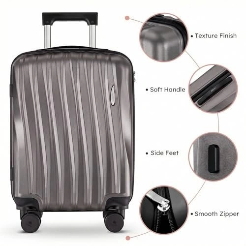 This is a stylish and durable 3-piece Suitour luggage set featuring a unique seashell arc design. The set includes a 19" carry-on, a 23", and a 27" checked suitcase. Made from high-gloss ABS hardside material, it's built to protect your belongings. The luggage features smooth and quiet 360° spinner wheels for easy maneuvering, a comfortable telescoping handle with multiple locking positions, and a reinforced side stand. Zippers are smooth-gliding and there's a built-in combination lock for basic security. The nesting design allows for 80% space saving when stored. Perfect for various trips, from short getaways to family vacations.