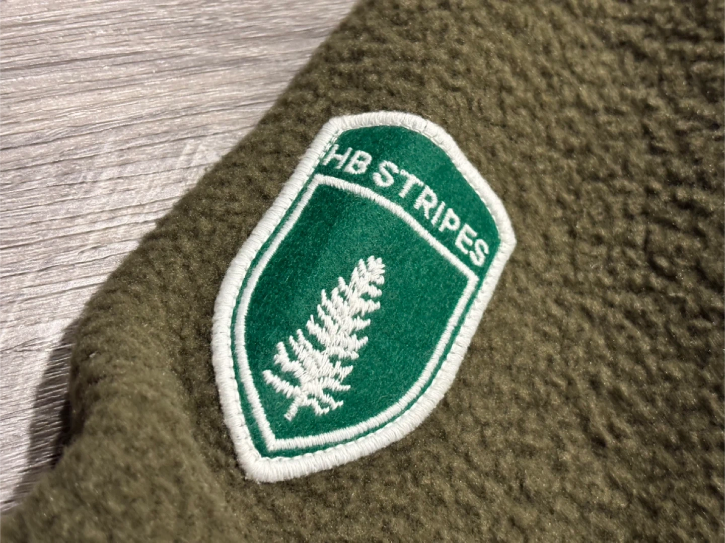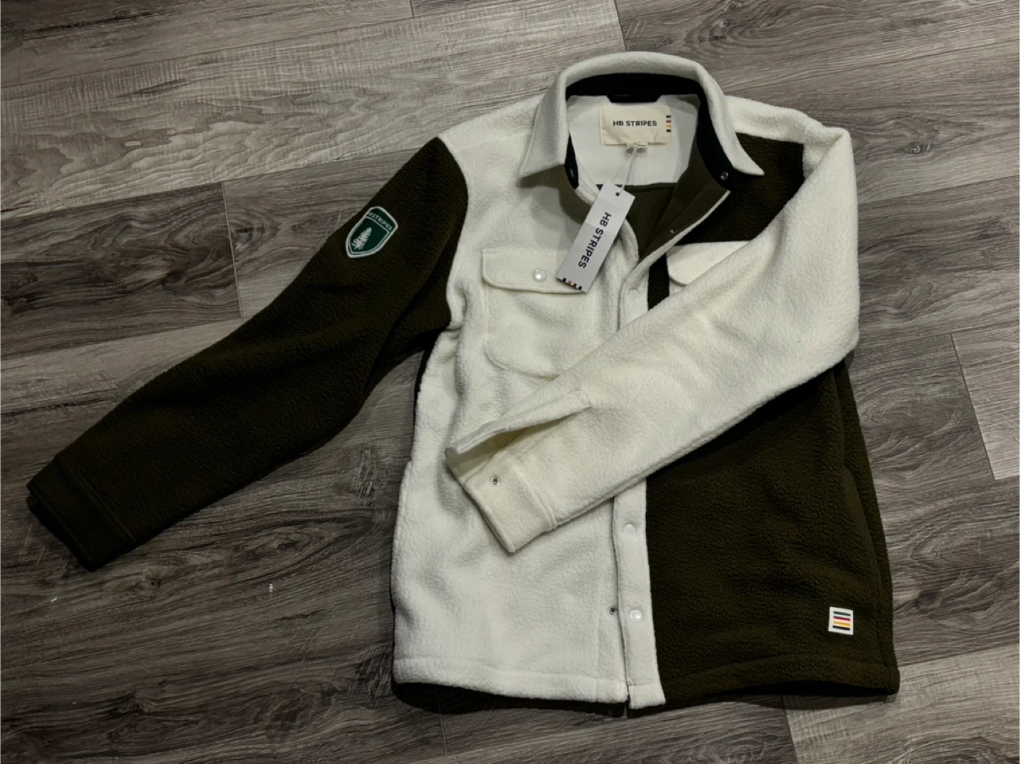 Cozy HB Stripes fleece shirt jacket in size small! This unisex jacket features a unique colour block design with olive green and white. Perfect for layering or wearing on its own during cooler weather.