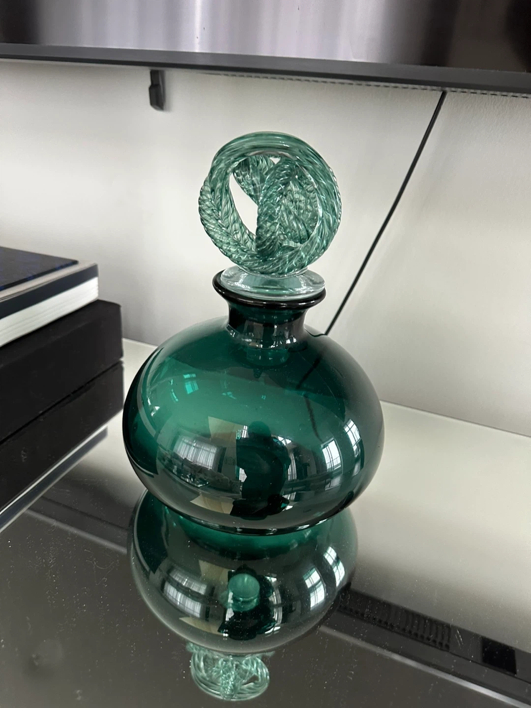 The brand BOMBAY Beautiful green glass decanter. It features a round body and a unique knotted glass stopper. Perfect for displaying on a shelf or for serving your favourite beverages!