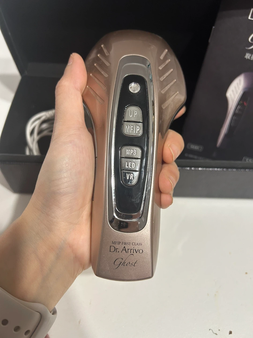 This is the Dr. Arrivo Ghost MFIP First Class beauty device. It's made in Japan. Includes the device, charging adapter, and instruction manual.