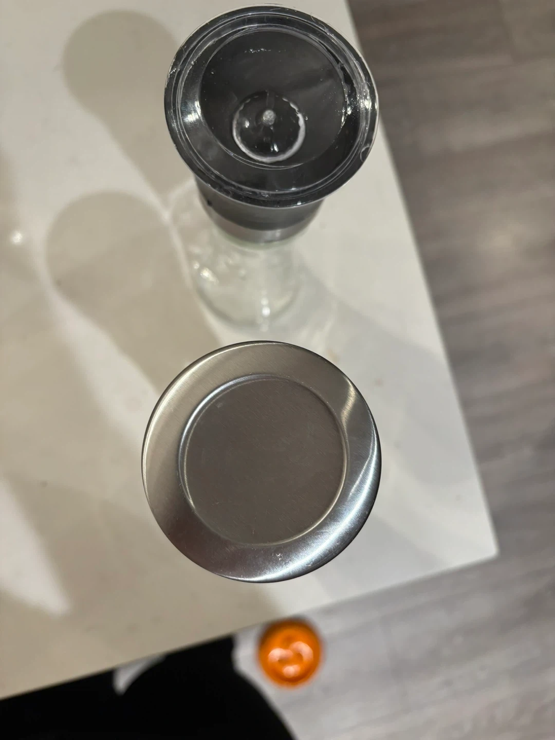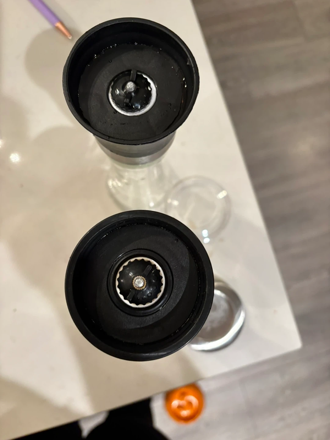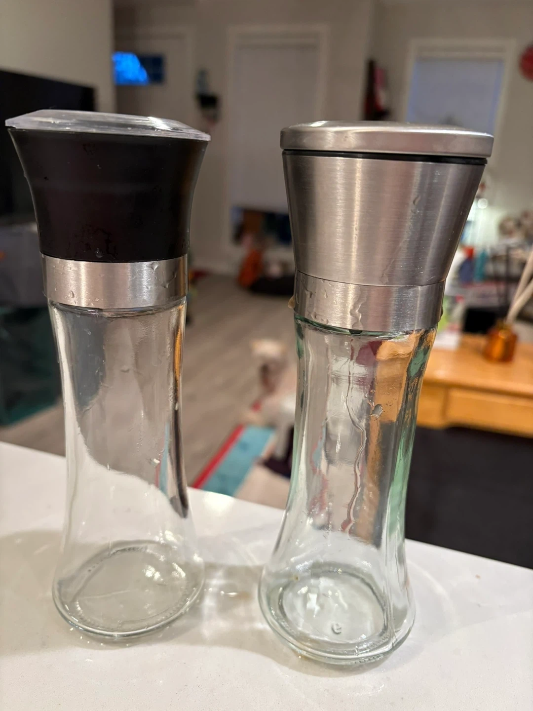 Selling a set of salt and pepper grinders. One has a clear top and the other has a stainless steel top. They are both in great condition!