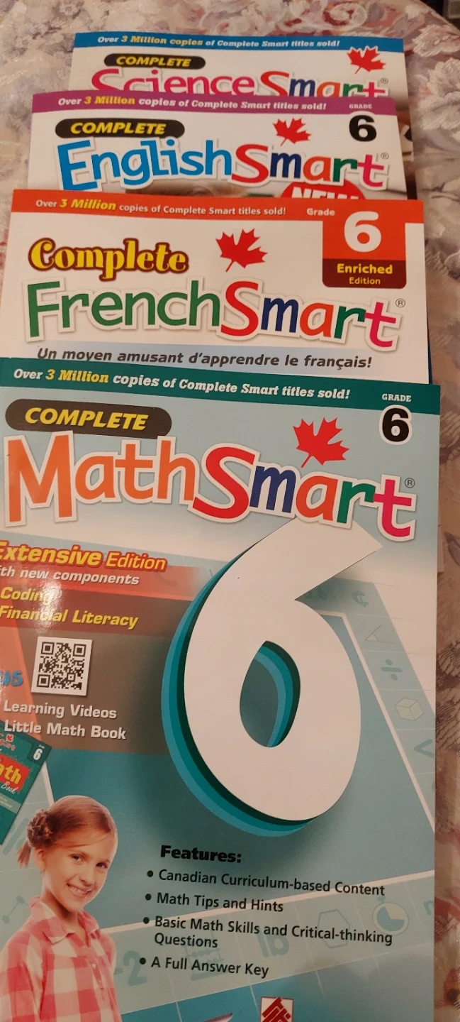 This is the Complete set of Grade 6 workbooks, Extensive Editions.Thrse books cover Math, French, English, and Science. All are Canadian Curriculum-based content. Tips and Hints, and Basic Skills and Critical-thinking Questions are within. They also include a Full Answer Key and Enrichment.