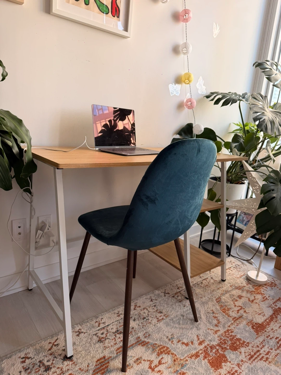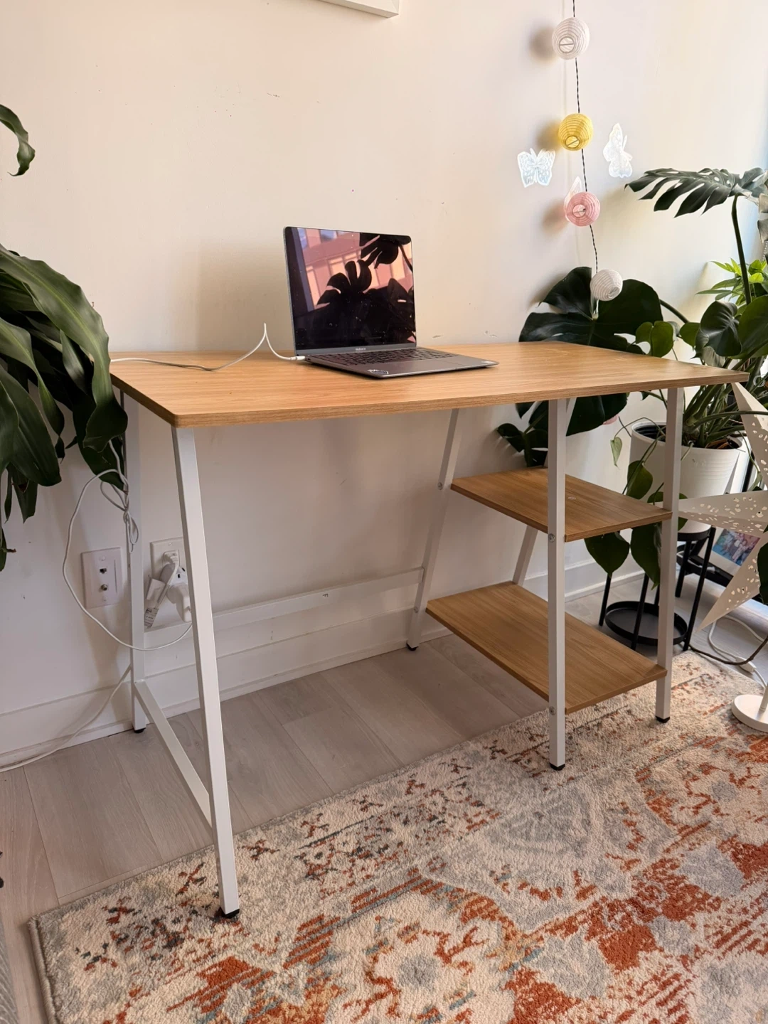 This desk features a natural wood-look top and three open shelves on the side. Its simple design makes it a versatile piece for any room. Metal frame construction.