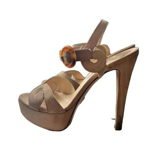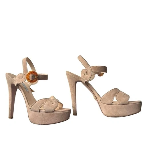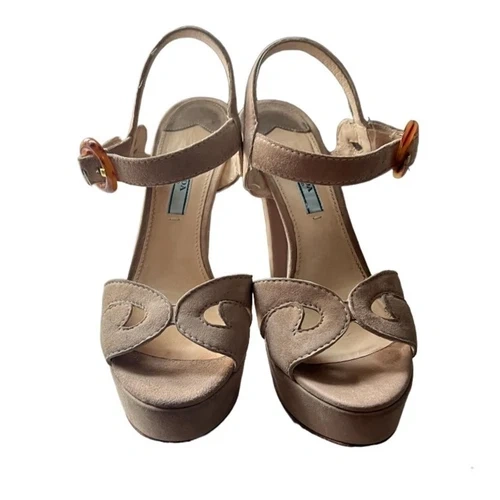 Prada Vintage Suede Tan Platform Heels with Tortoise Buckle Size