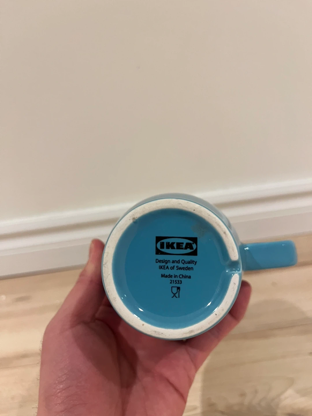 Vibrant blue mug from IKEA. Has a cool teal color. Great for your morning coffee or tea. Bottom has IKEA brand info. Sturdy ceramic.