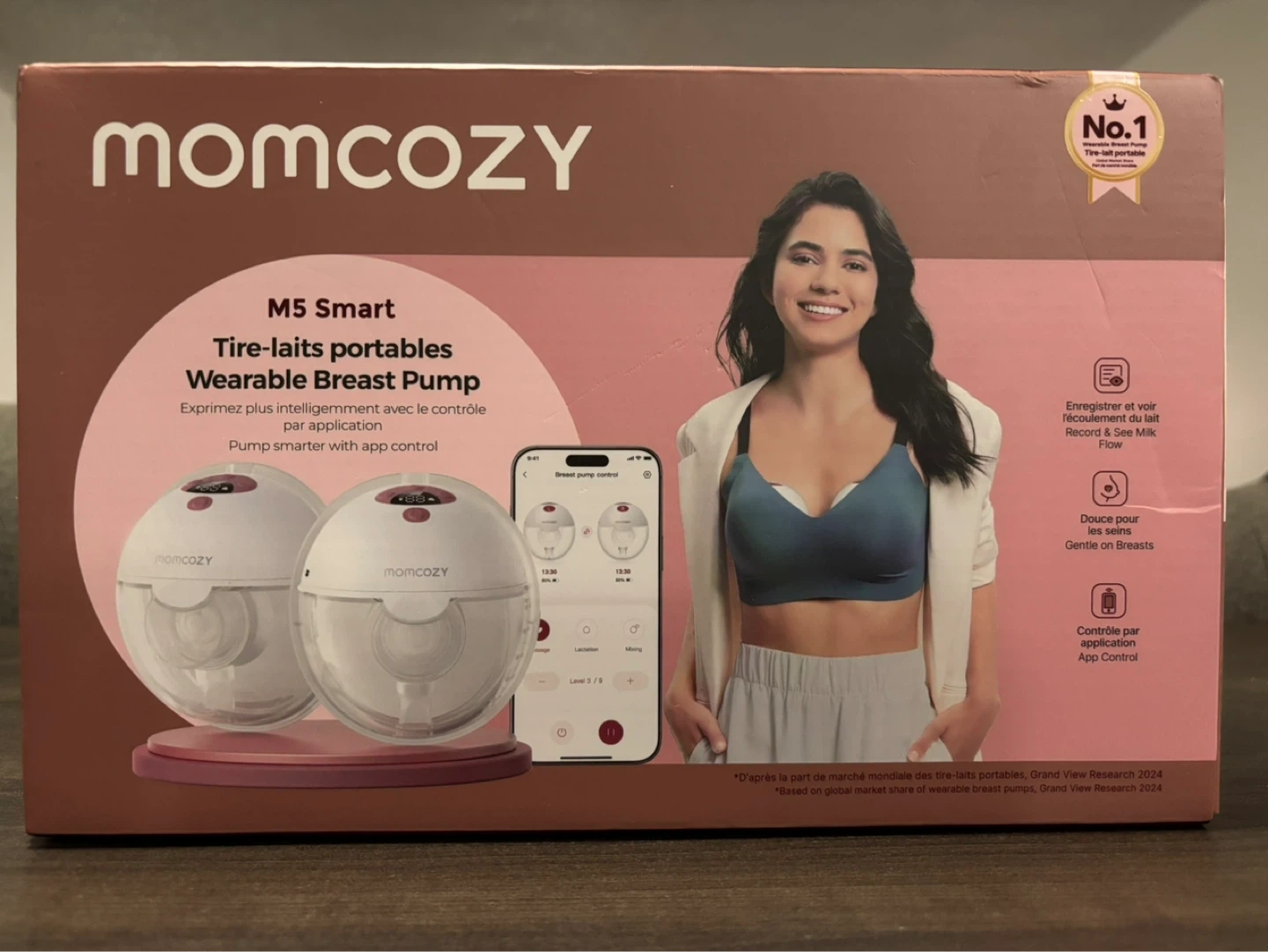 This is a Momcozy M5 Smart Wearable Breast Pump. It's designed for smart pumping with app control. Gentle on breasts and includes app control for recording milk flow.