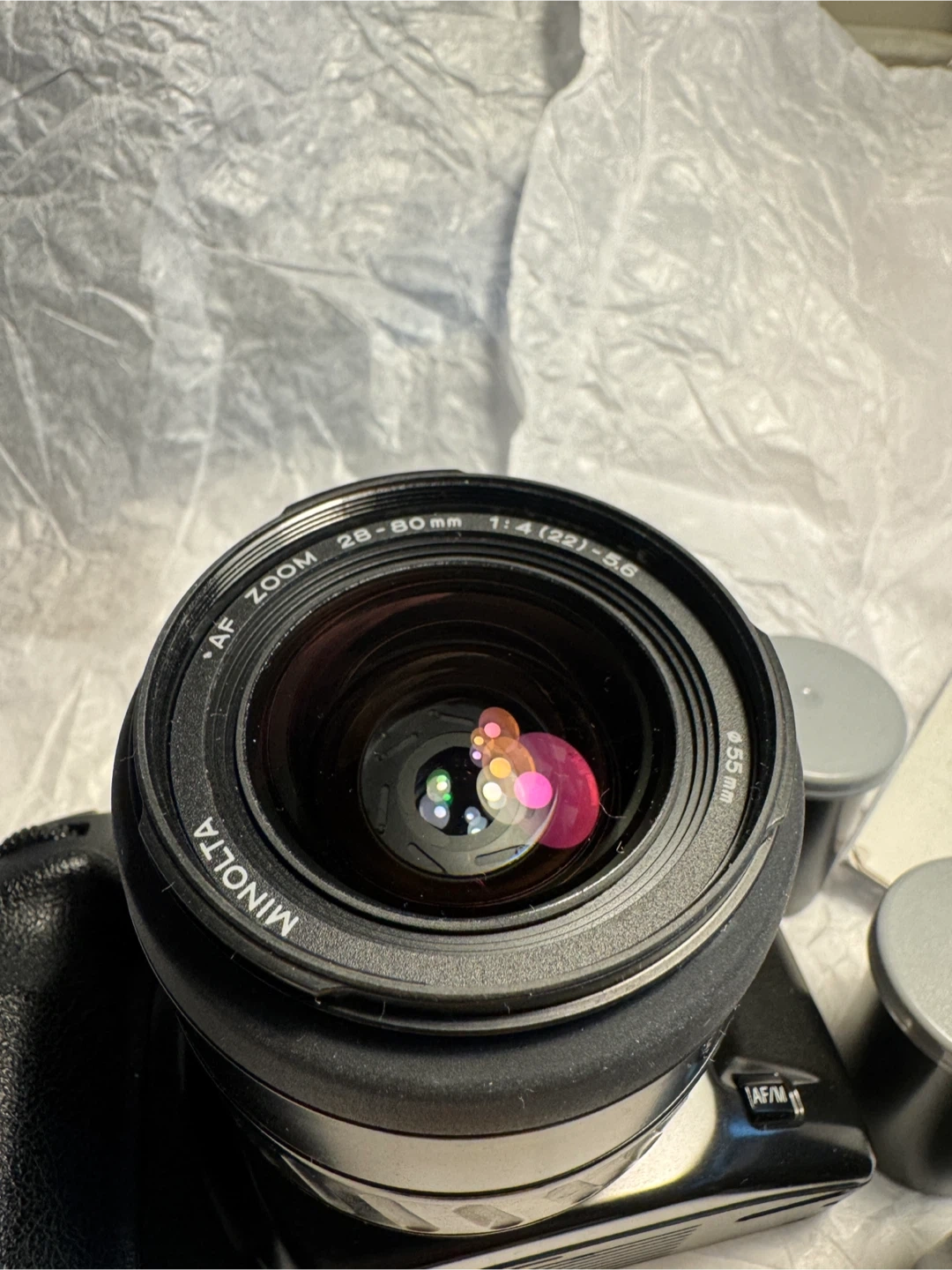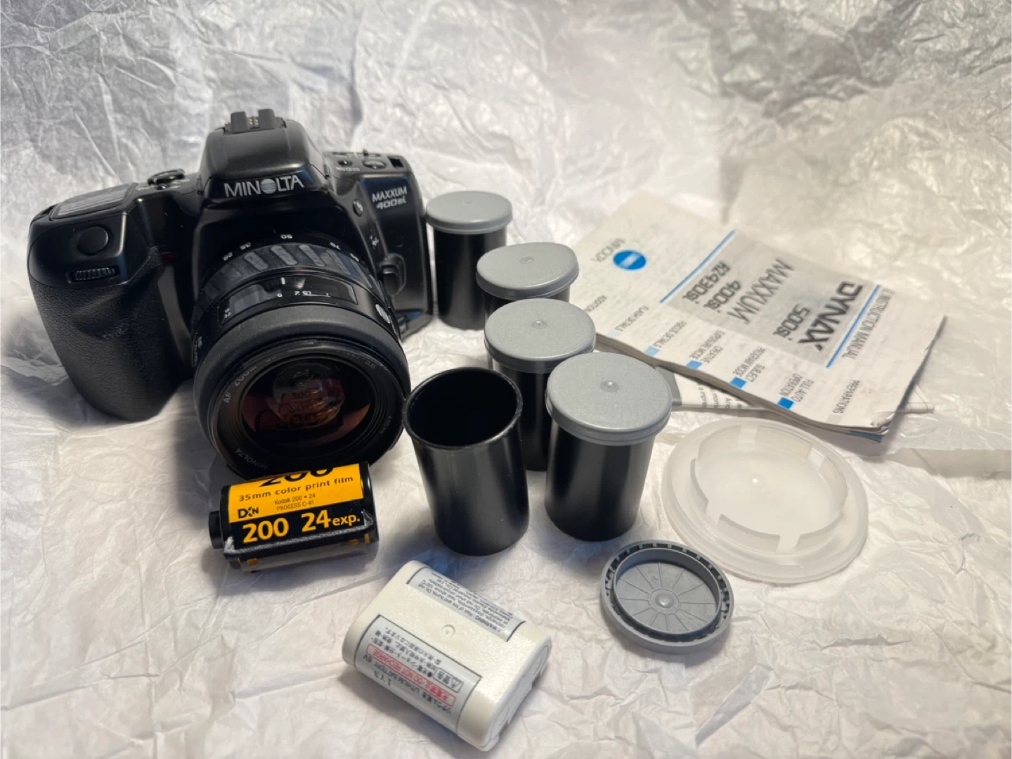Bundle includes a lightly used, well-cared-for Minolta film camera (Maxxum 400si) with a 28-80mm AF kit lens (macro, f/4-5.6, clean, no haze, no fungus, no scratches). Also includes 5 rolls of expired Kodak 35 film (ISO 200, 24 exposure) and one new Panasonic 2CR5 lithium of battery. As a photography enthusiast, the camera has been cared for in detail and stored in a cool, dry place. The new battery was inserted recently to ensure it still works. The lens was recently used on another digital camera and works fine.