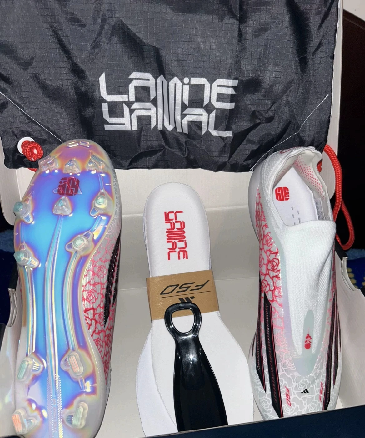 Brand new Adidas FSO soccer cleats in collaboration with Lamine Yamal. Features a white and red floral design. Includes a shoe horn and dust bag.