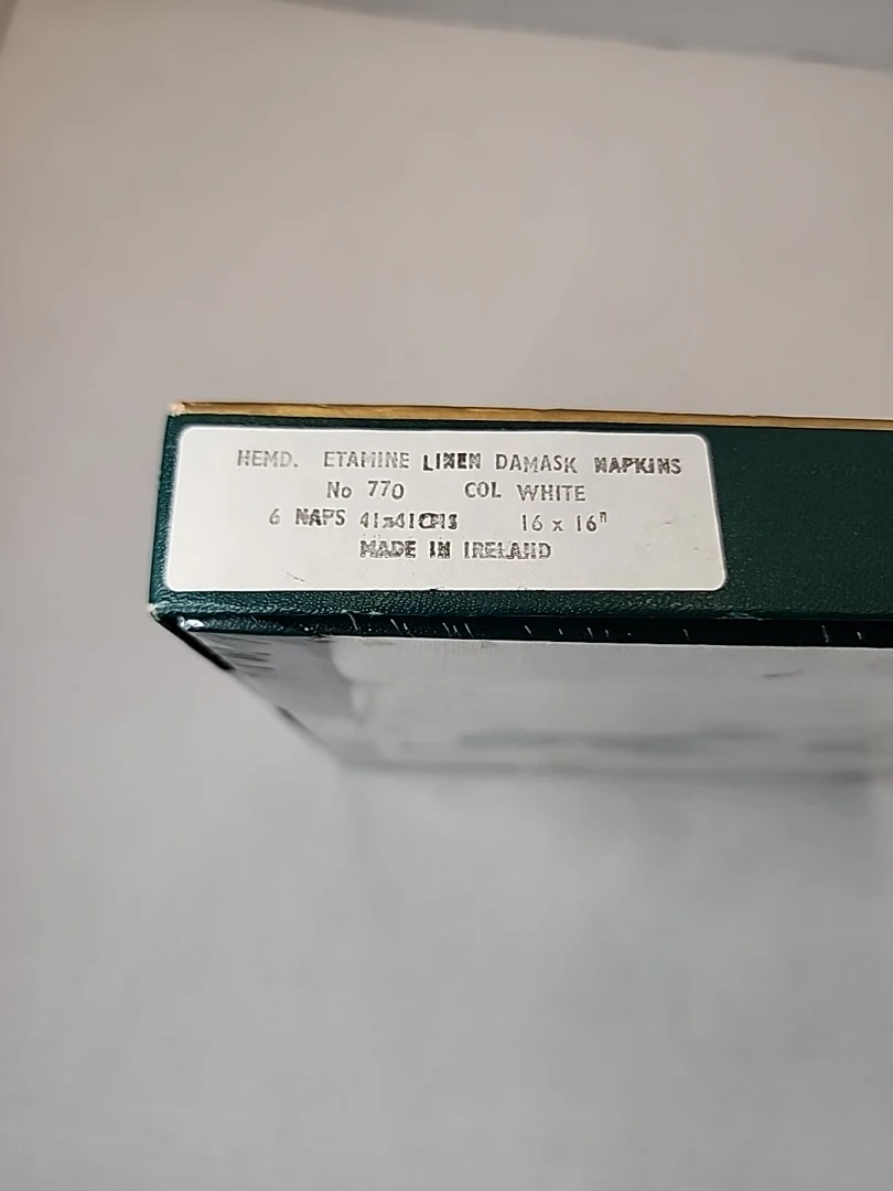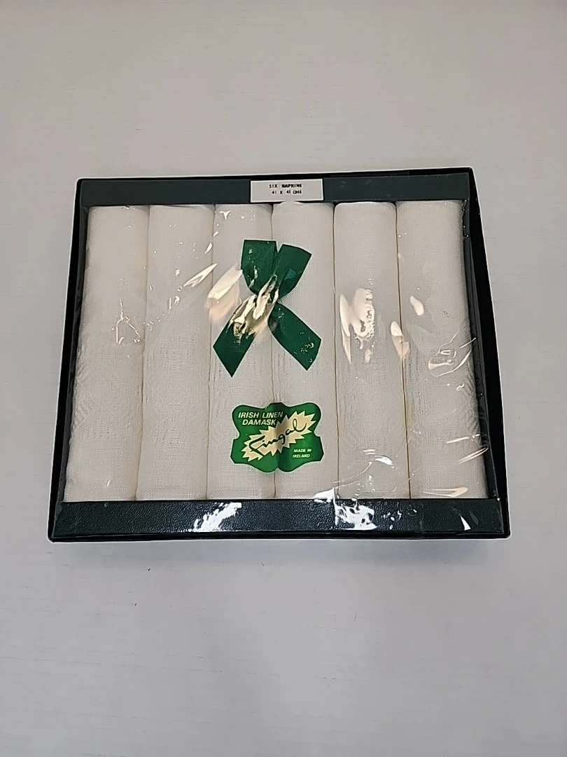 This is a new-in-box set of six Fingal Irish Linen damask napkins. The napkins are made of 100% linen and measure 41 x 41 cm