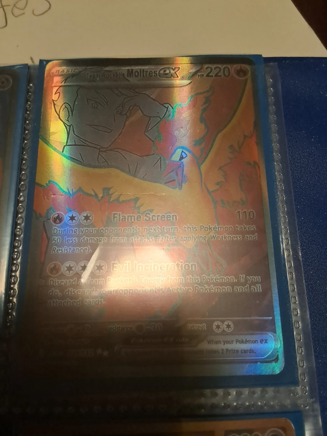 This is a Team Rocket's Moltres EX Pokemon card. It has a HP of 220 and features the 'Flame Screen' and 'Evil Incineration' abilities. This card is great for collectors and Pokemon TCG players looking to expand their collection.