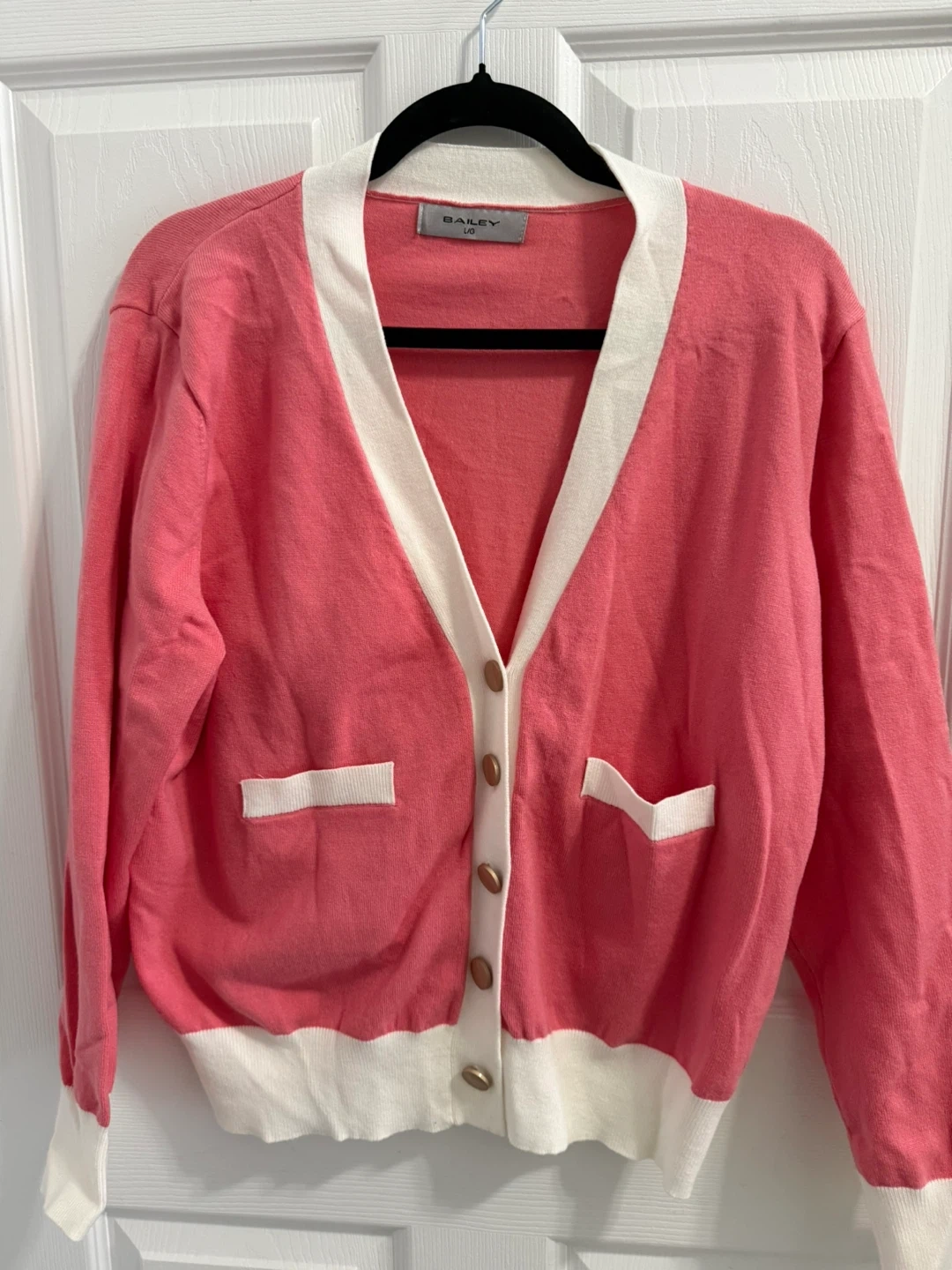 *New* Brian Bailey long sleeved cardigan in a lovely coral pink with white trim. It features a V-neckline and two front pockets, with gold colour-toned buttons. The size is L.