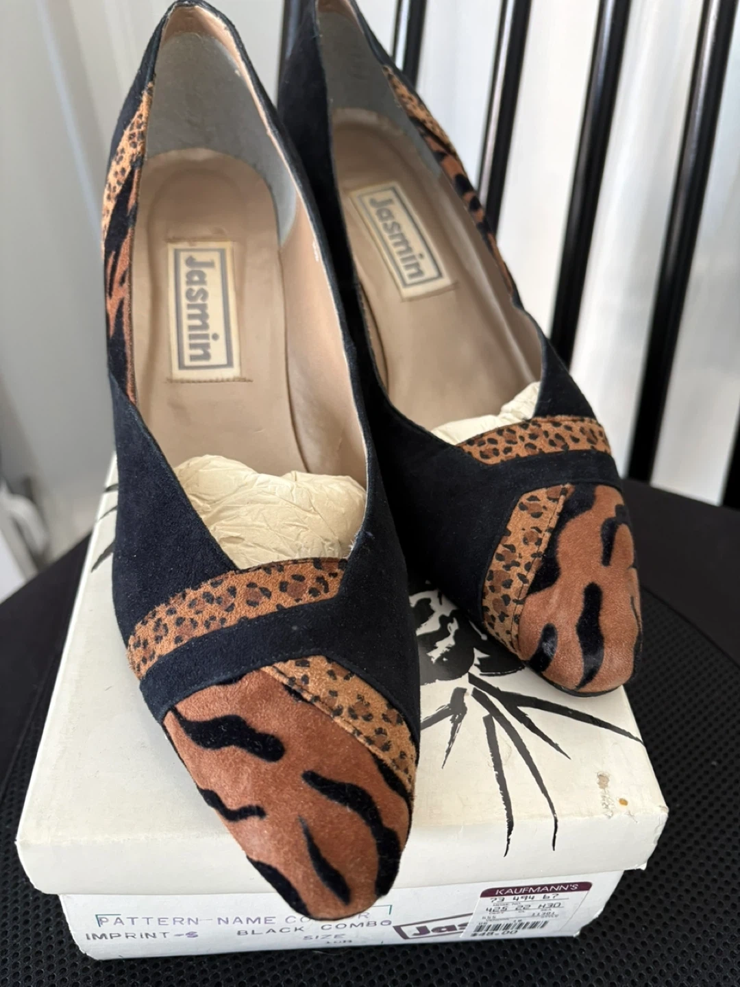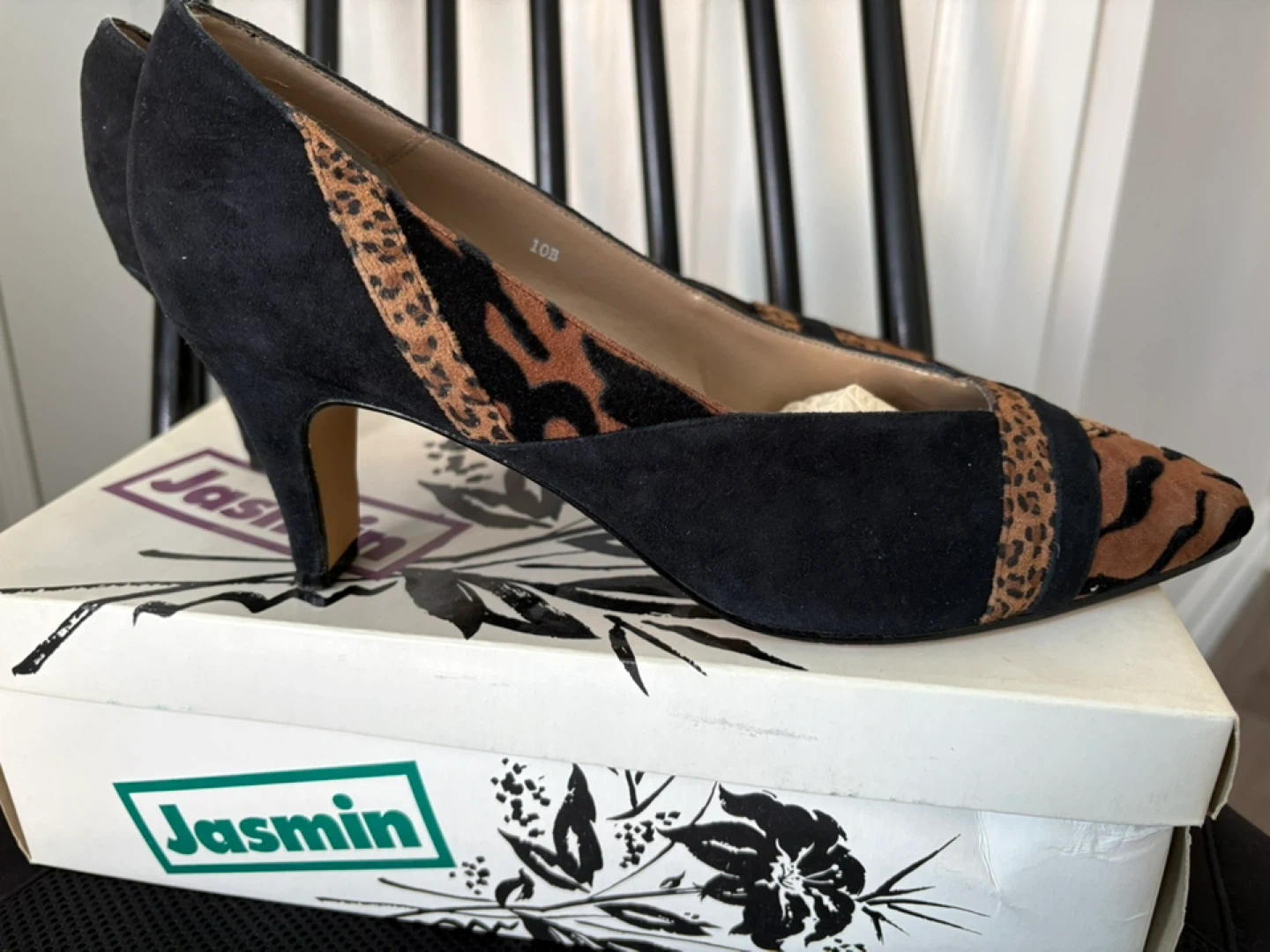 These Jasmin heels feature a black suede and leopard print design. They're a size 10B with a pointed toe and a stiletto heel. These shoes are perfect for a night out or adding a touch of wild style to an outfit!