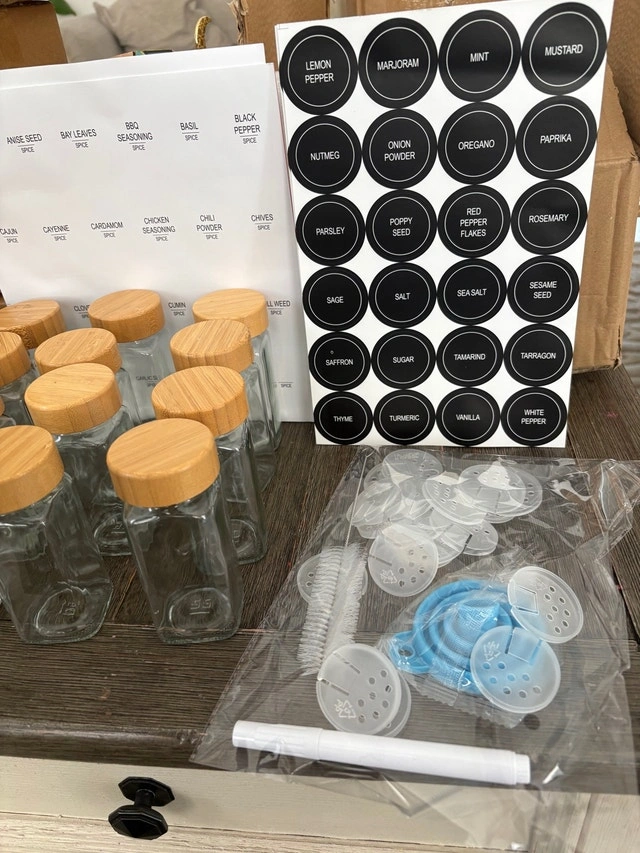 New in Box: 24pc 4oz Glass Spice Jars w/ Bamboo Lids