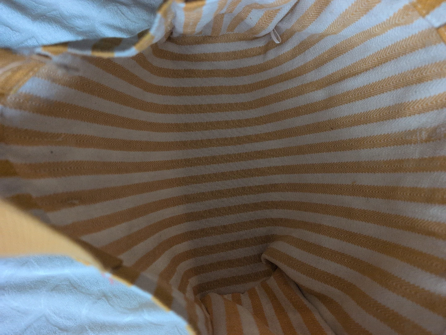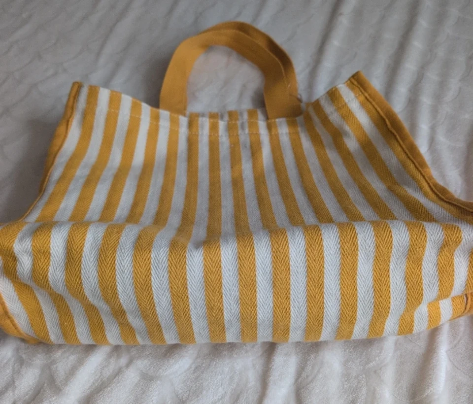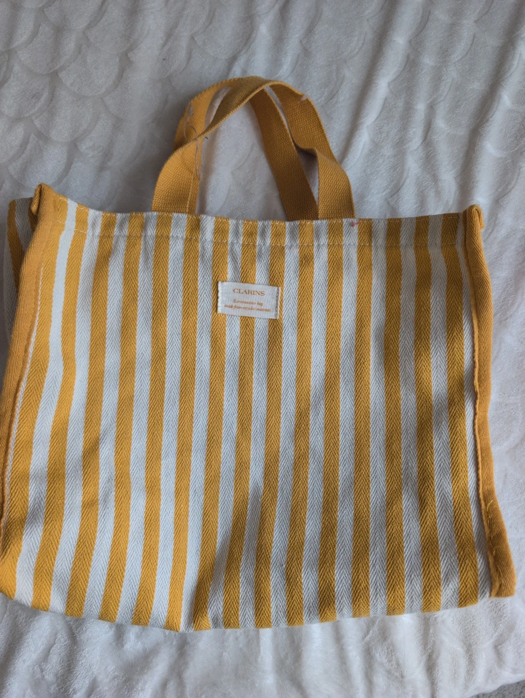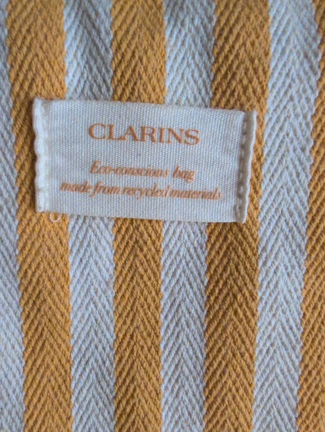 This is a Clarins eco-conscious bag. It's made from recycled materials and features a yellow and white striped pattern. It's a handy tote for everyday use.
