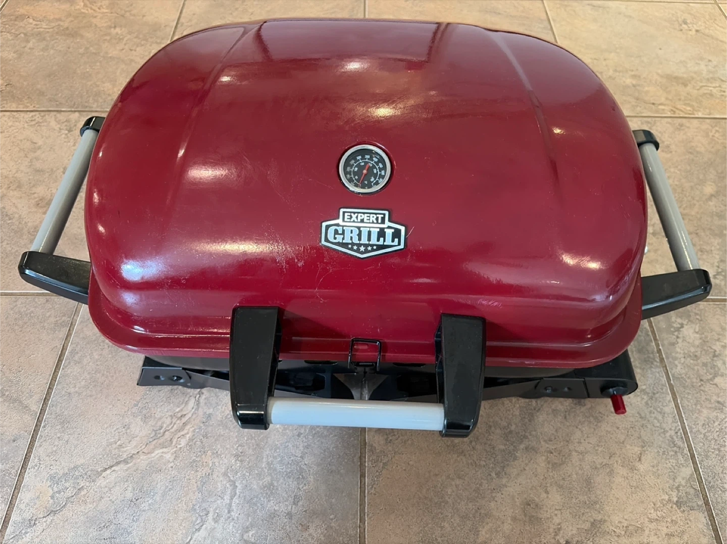 Expert Grill portable propane gas grill in red. It's compact and easy to transport. Great for camping trips or tailgating events!