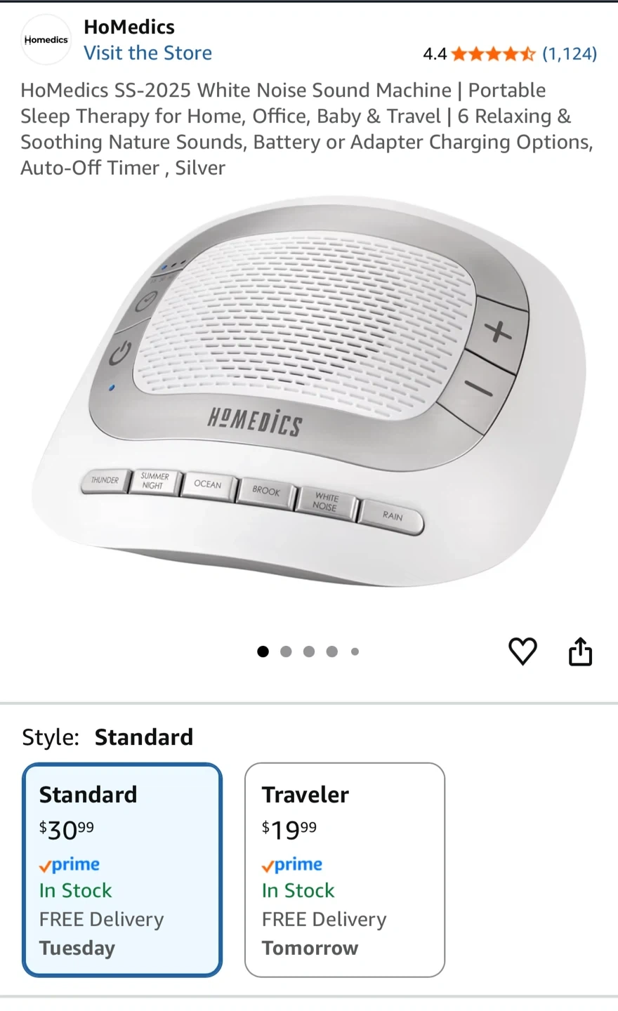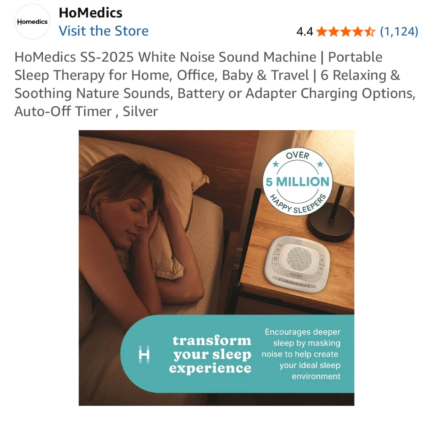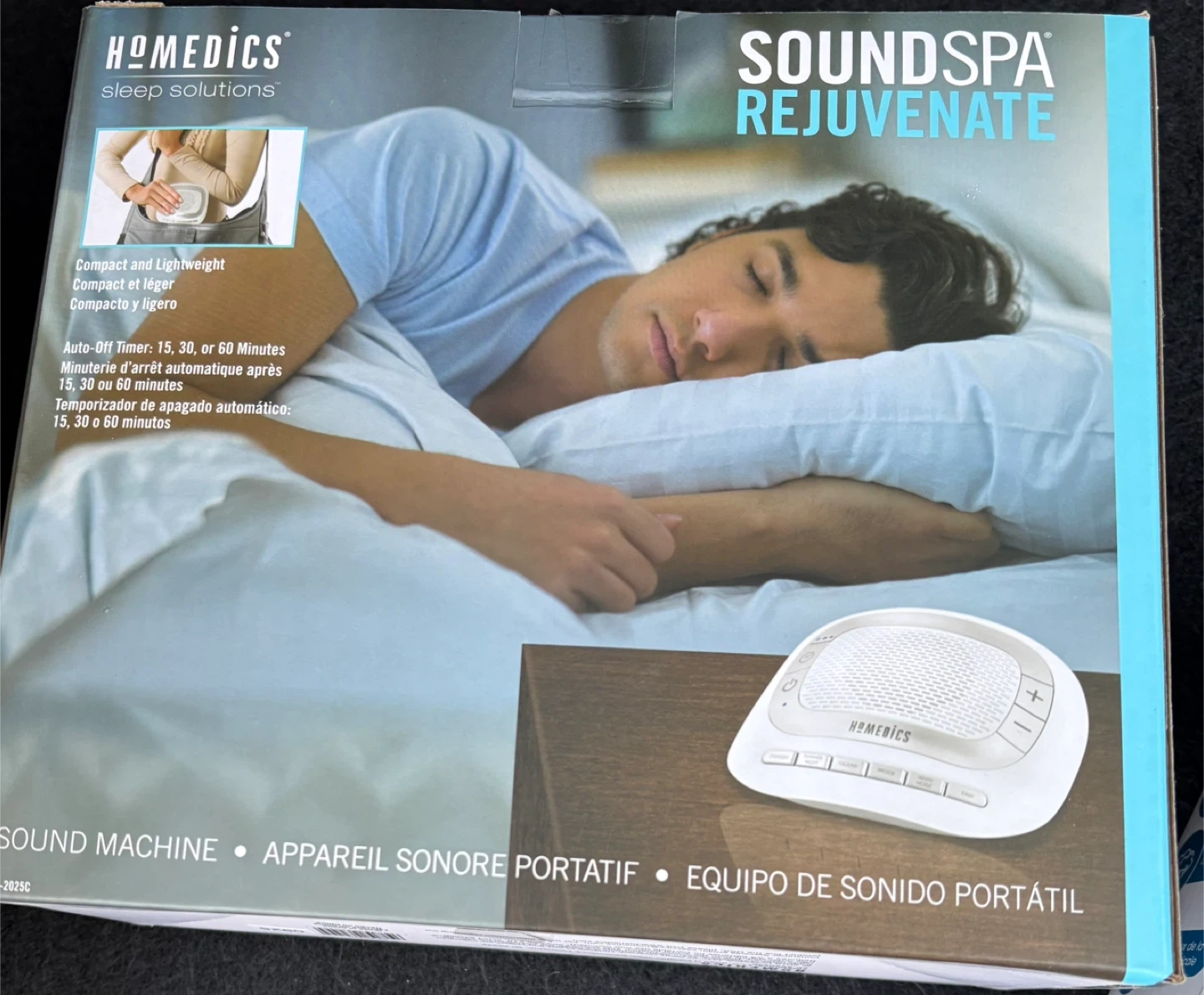 Selling a HoMedics SS-2025 white noise sound machine! It's great for home, office, baby, and travel. It features 6 relaxing and soothing nature sounds and has an auto-off timer. It's lightweight and portable and can be used on the go with 4 AA batteries or plugged into a wall outlet. The dimensions are 6.5" x 5.2".