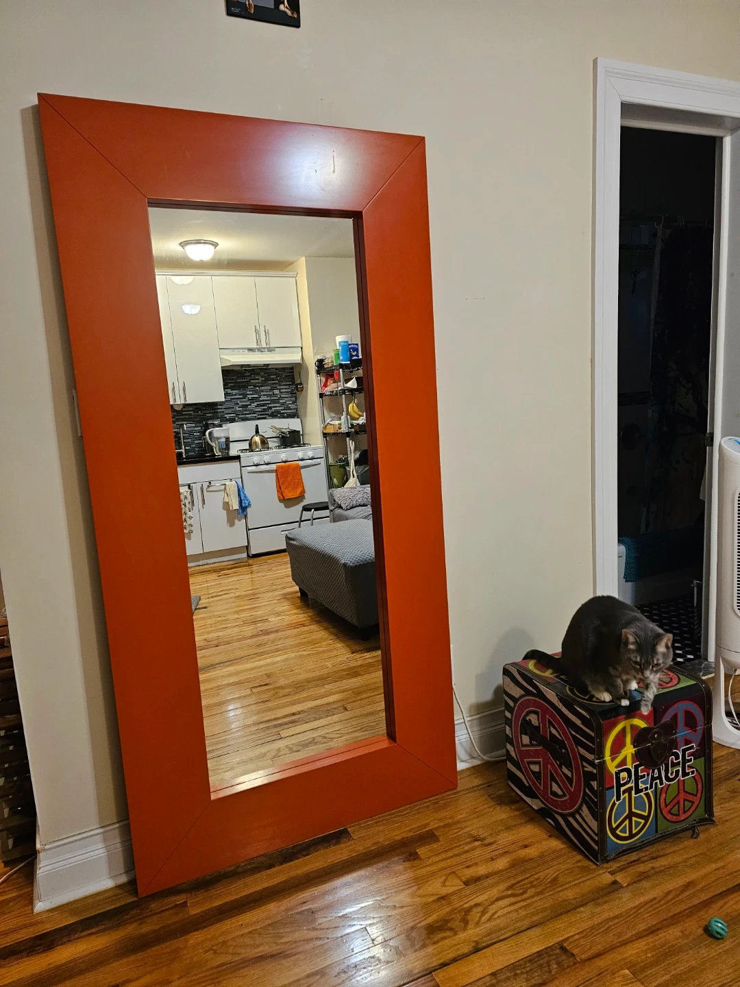 A large full-length mirror with a vibrant orange frame. It's perfect for checking your outfit or brightening up a room. The frame is made of sturdy wood. 37" height, 74" length, 2" width. Cat not included.