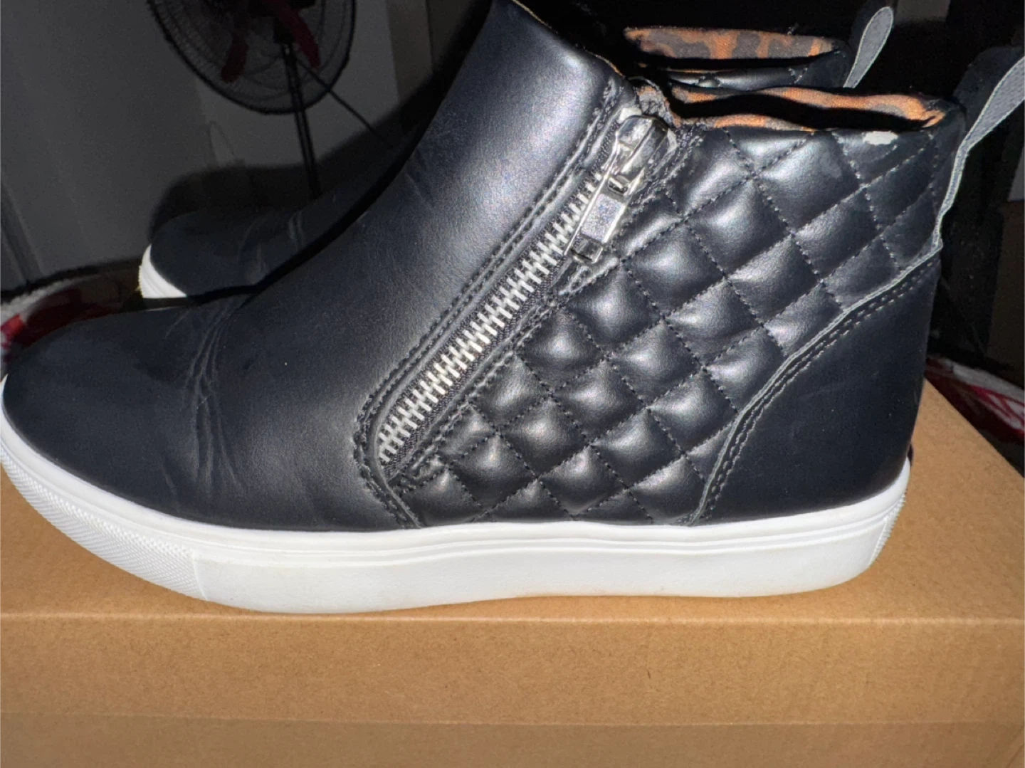 Selling a pair of Steve Madden JReggie zippered black ankle booties size 3Y big girl that features a quilted design. The inside lining is leopard textile and The outsole is leather.
