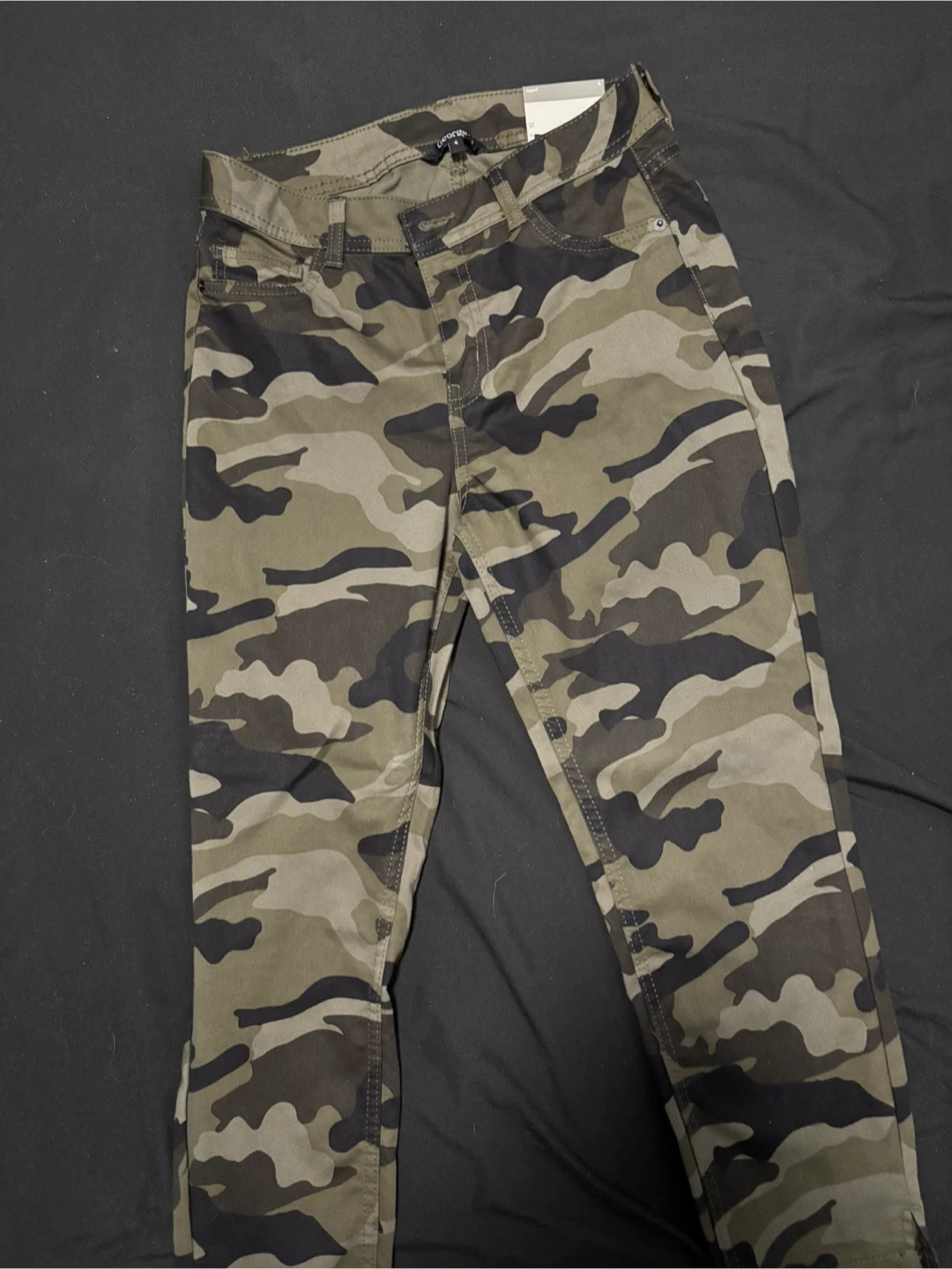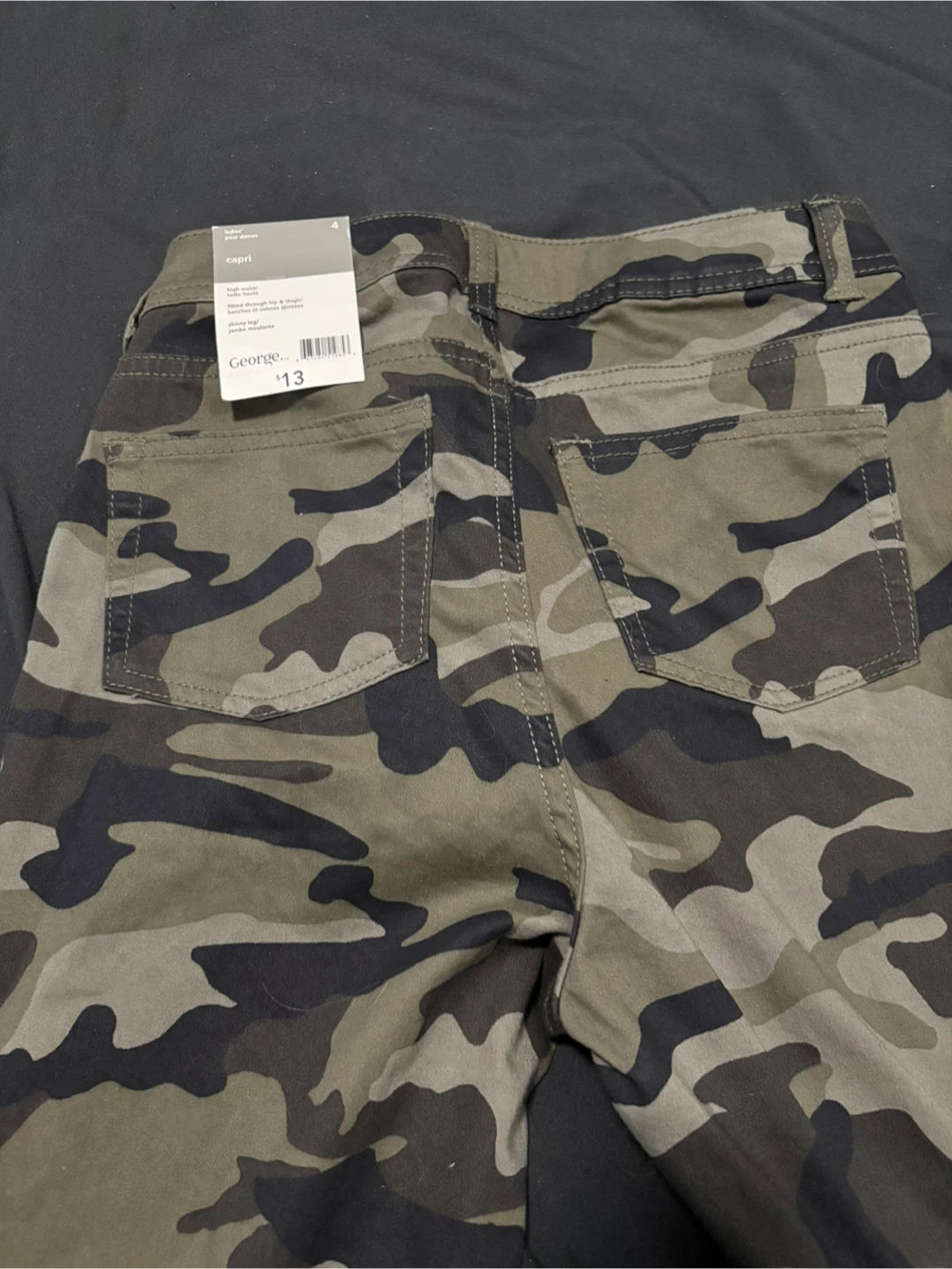 George women's capri pants in a camouflage print. High rise with a zip fly and button closure. Includes belt loops and classic pocket design. Size is 4. Have never been worn. Pick up in the Northend.