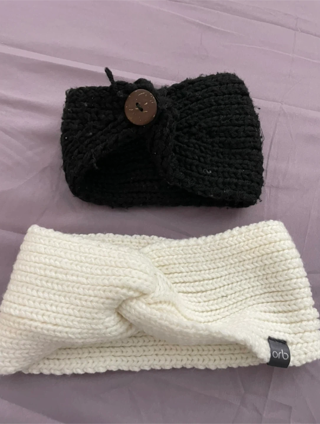 Selling a set of two knitted ear warmer headbands. One is black with a wooden button detail, and the other is cream-coloured with a twisted knot design. Both are made of a soft knit material, perfect for keeping ears warm on chilly days.
