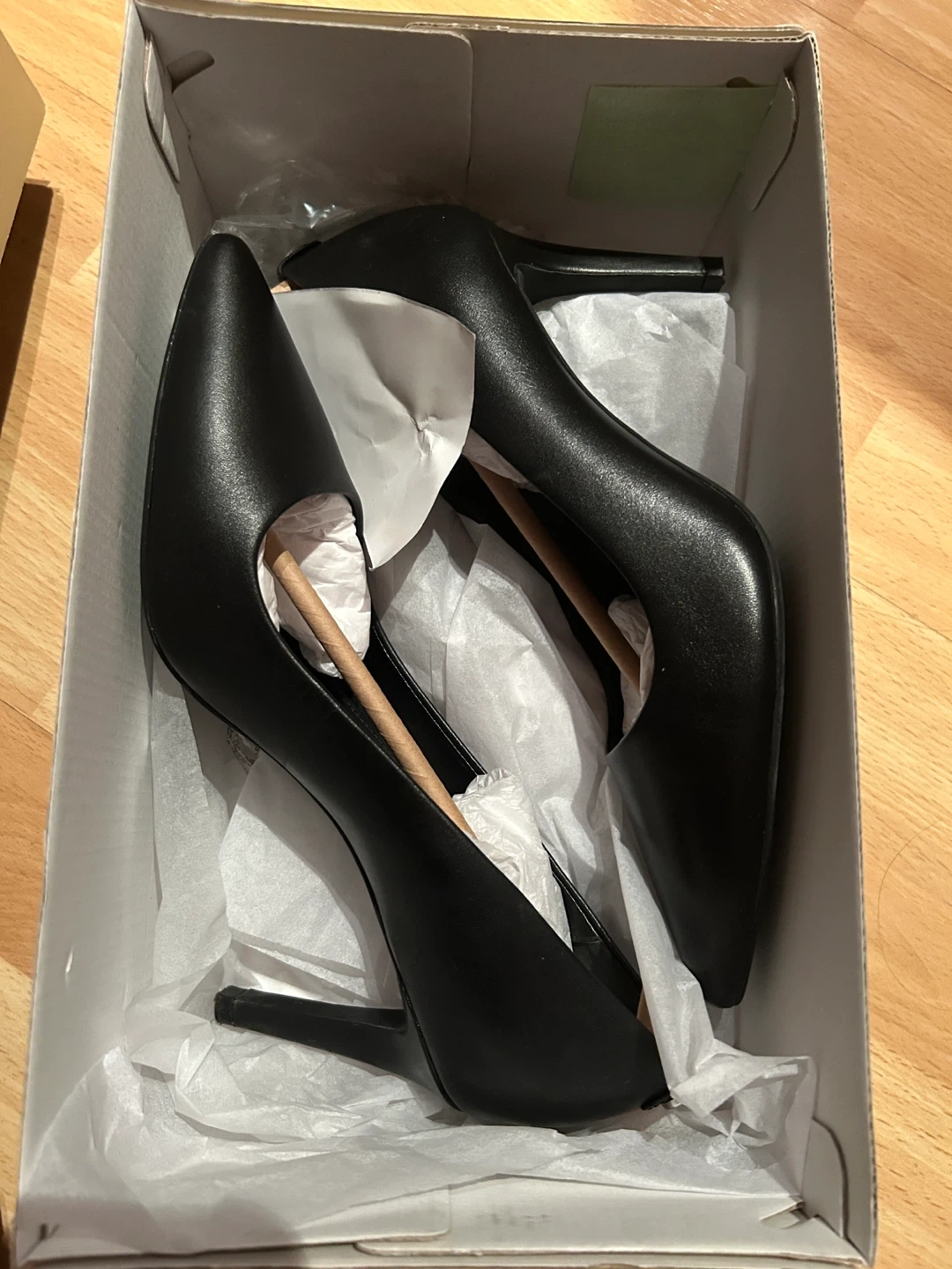 These Michael Kors heels are a classic black colour. They come in their original box. These pumps have a stiletto heel. Not a high heel person, only wore once for a good friend’s wedding.
