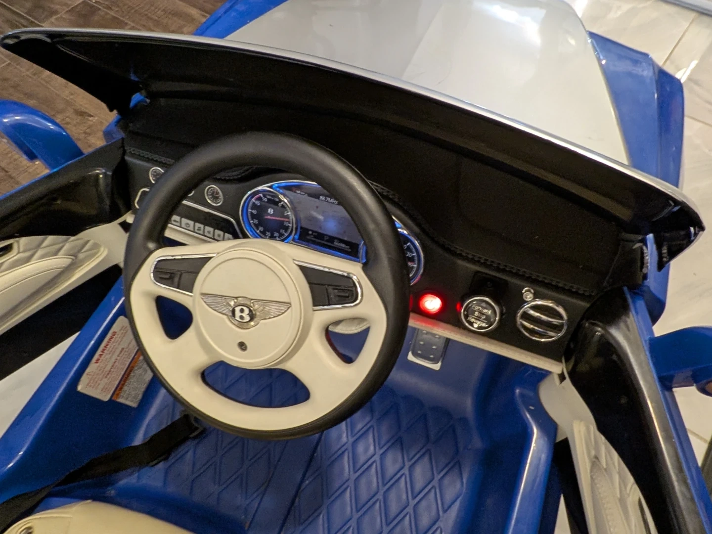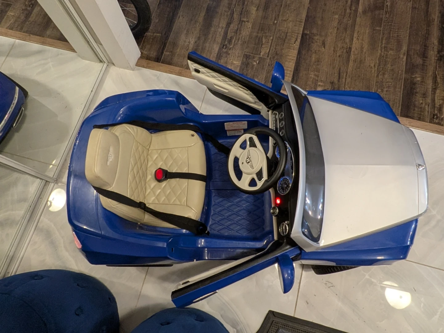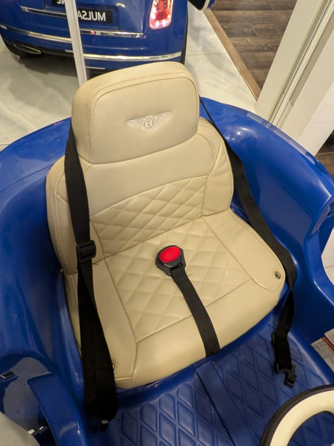 A stunning Bentley kids ride-on car in a beautiful blue and silver combination. This meticulously maintained car is in pristine condition, having been only used indoors, ensuring a perfect working order. It's a rechargeable car complete with a remote control and a charger. While it has been used, there are only some unnoticeable wear and tear marks on the car. Give your child the joy of luxury and make every ride an unforgettable adventure! Interested buyers, contact now! Your little one enjoy ride on it....