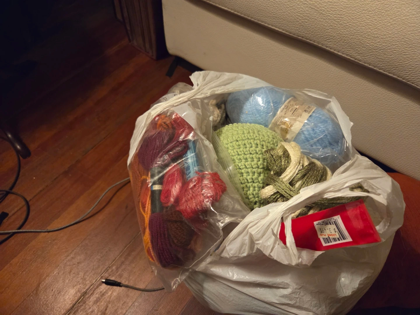 Bundle of various yarns and embroidery floss threads. Includes blue yarn, green crochet piece, and multi-coloured embroidery floss. Great for crafting projects!