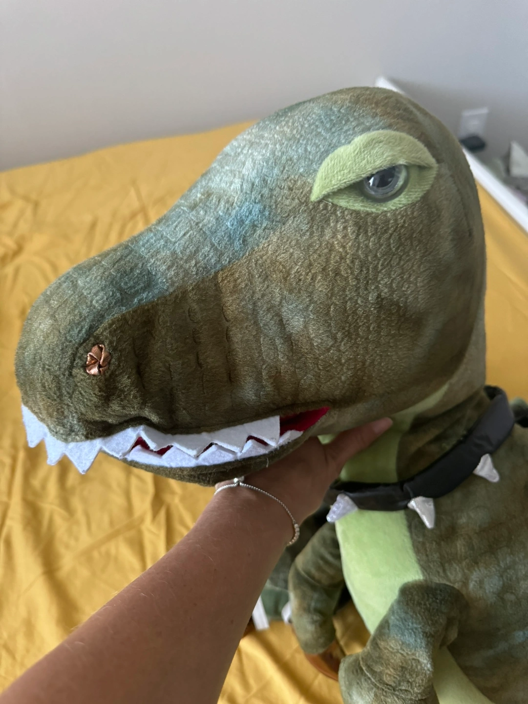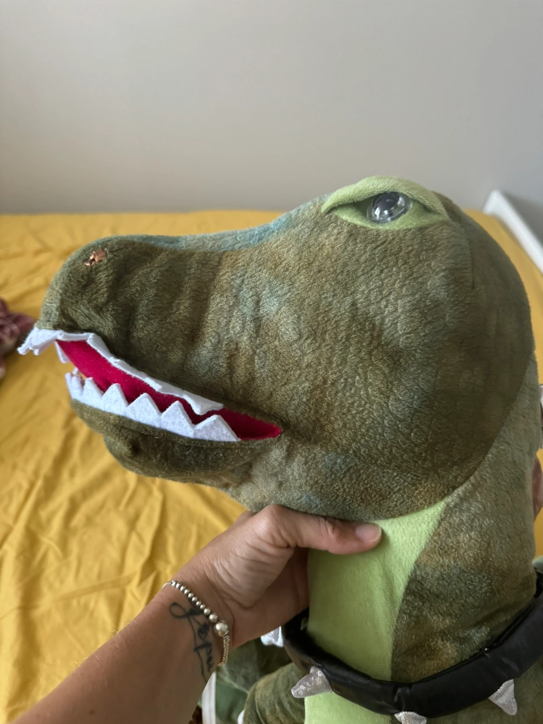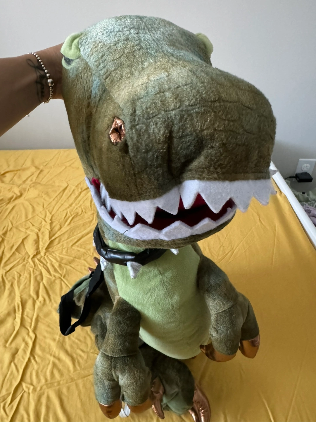 Size 3-7 yrs old / 98-122 cm. This is a great dinosaur costume that makes noise (roars) and the eyes turn red while roaring. Can be worn as pants and hold the head with the strap. It is made of plush material and has a collar with silver spikes. The costume has a back strap.