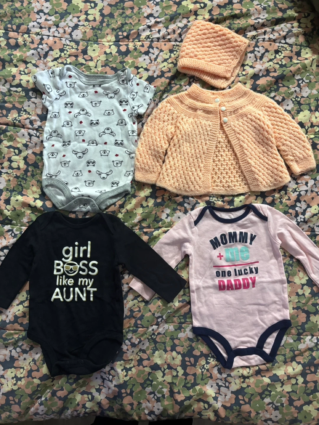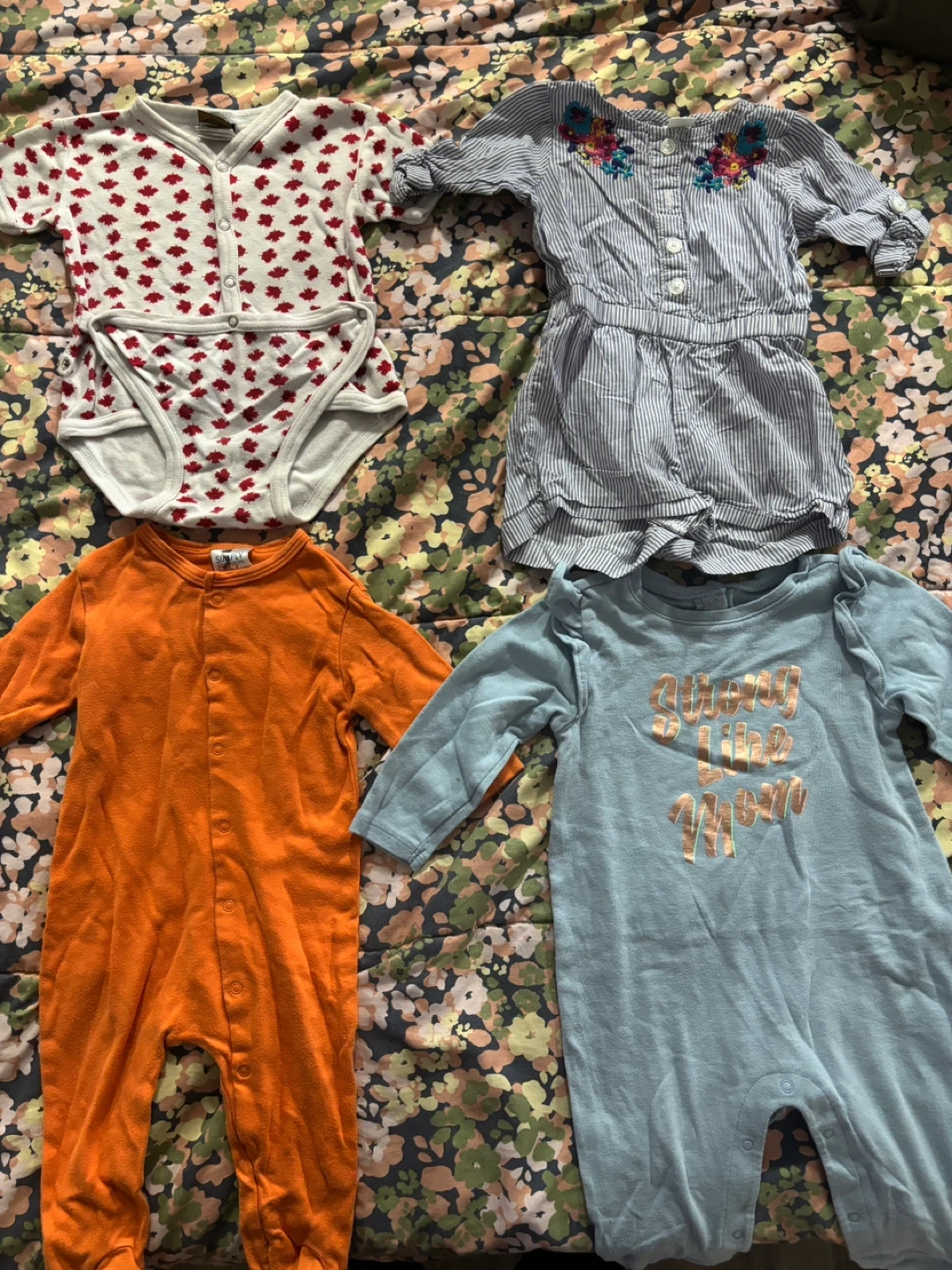 Selling a bundle of baby clothes in various sizes and from different brands like Carter's, H&M, and The Children's Place! There are bodysuits, pants, dresses, and more, all in good condition. Perfect for a little one's wardrobe!