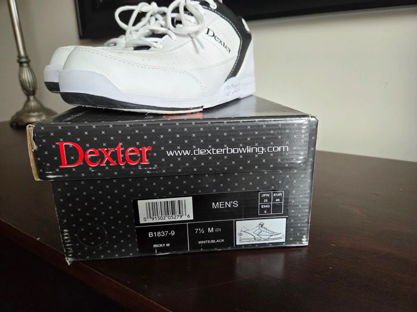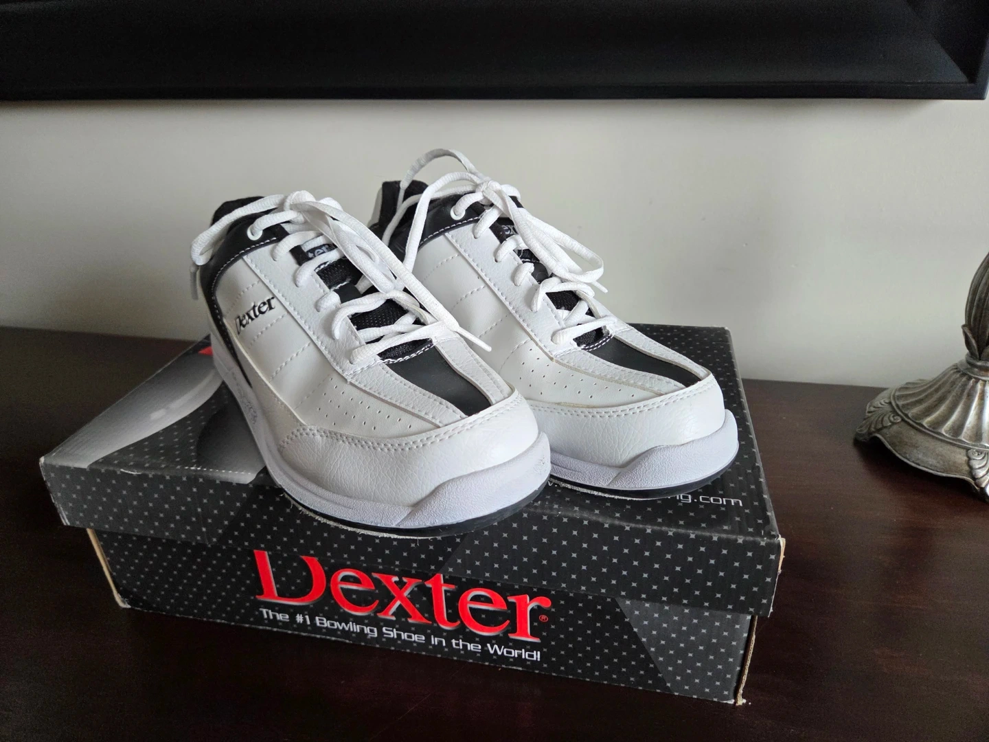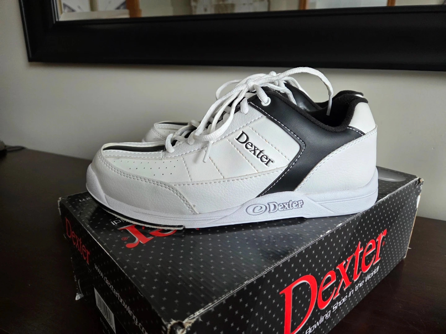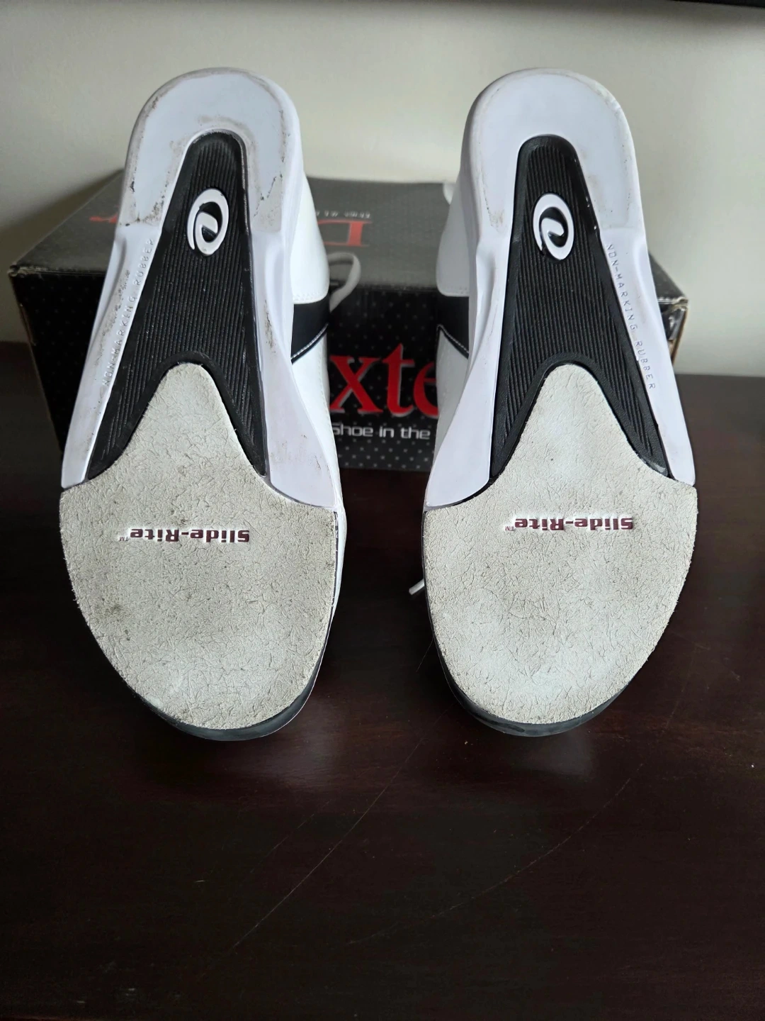 Dexter Ricky III bowling shoes in white and black. Men's size 7.5 M. These shoes have Slide-Rite soles. They come with the original box. Excellent condition, weren't worn for a full season. From a smoke free home.