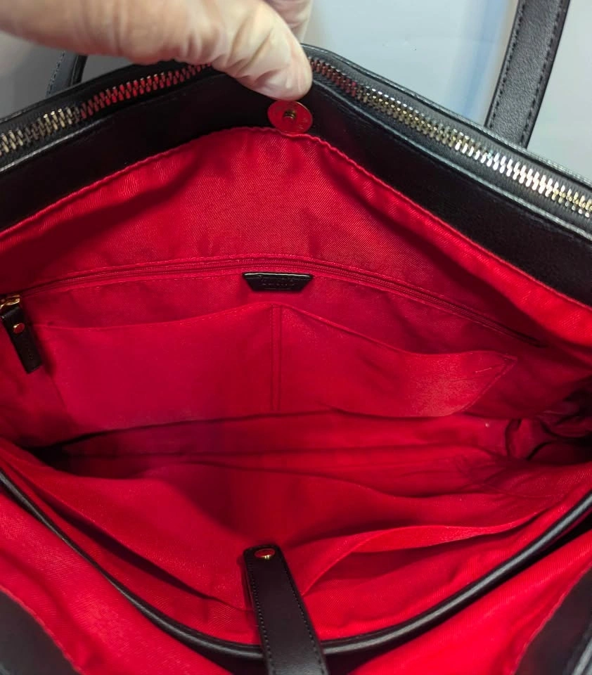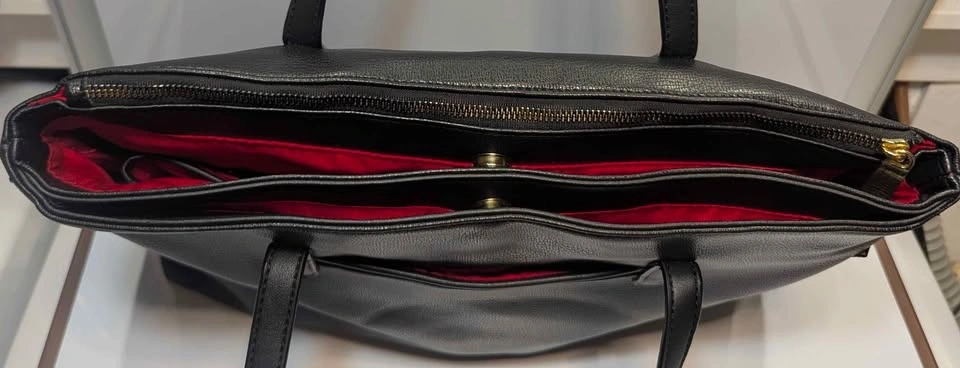 Signature Styling: Crafted from durable, black pebbled faux leather that resists wear and maintains its structured shape. The interior is finished in a vibrant, high-visibility red lining, making it easy to find small items at a glance.