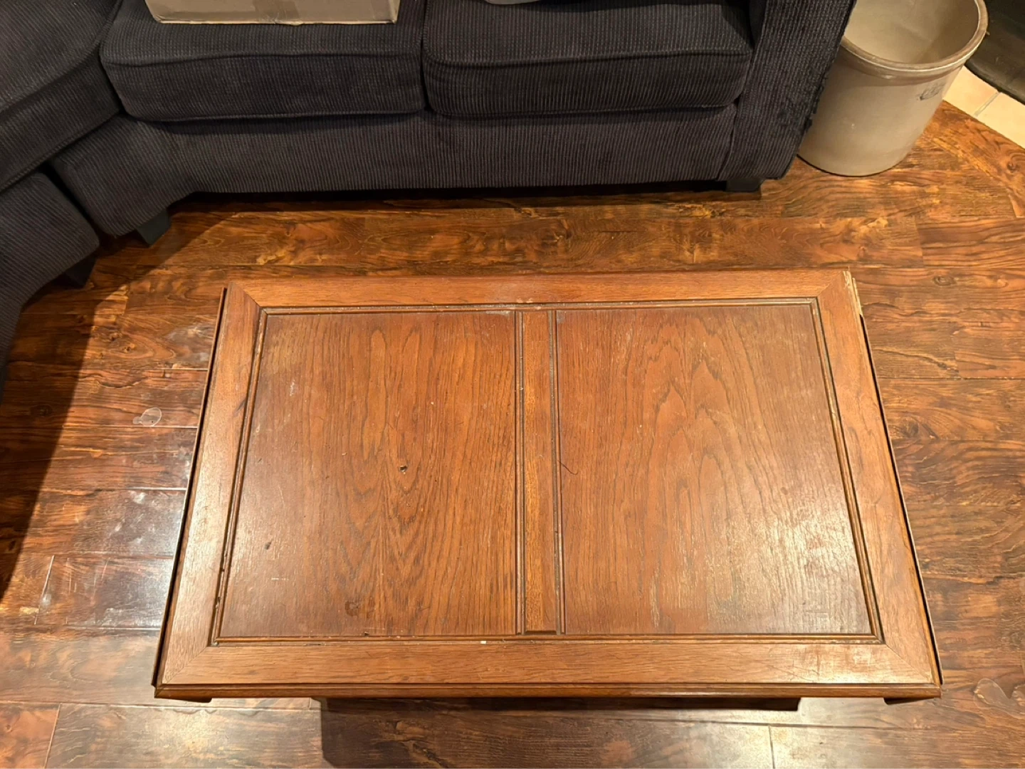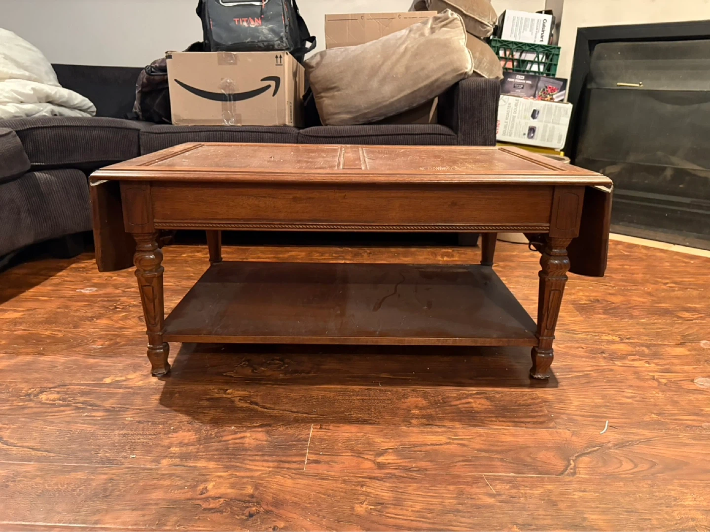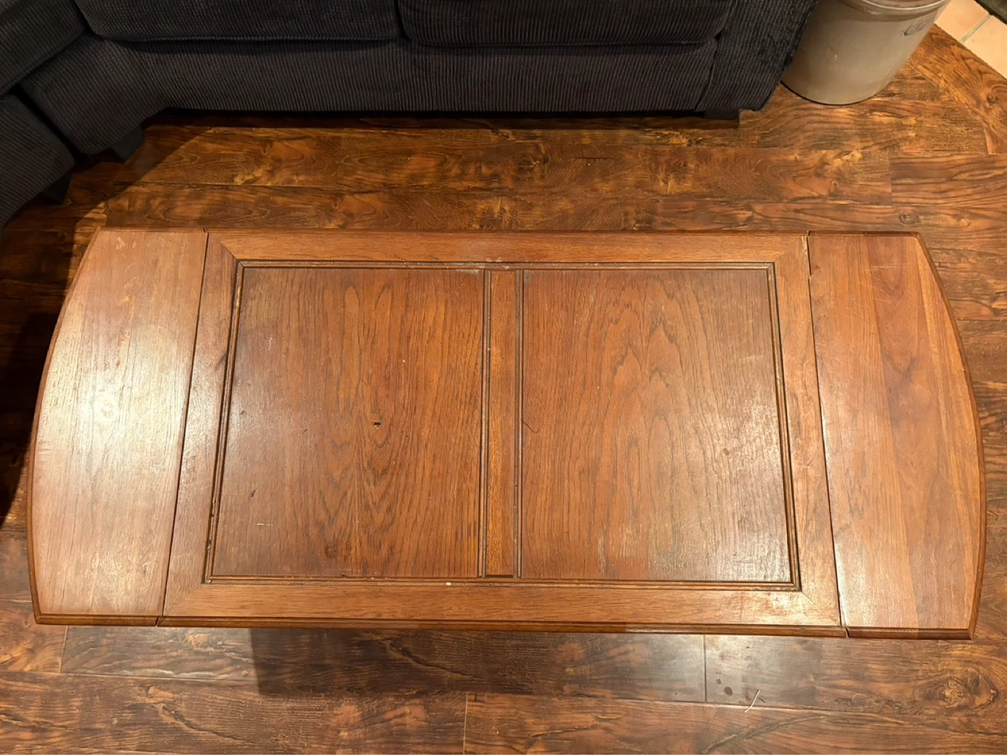 A classic wooden coffee table featuring ornate legs and a lower shelf for extra storage. It has drop leaves on both sides, offering flexibility in surface area. Solid wood construction.