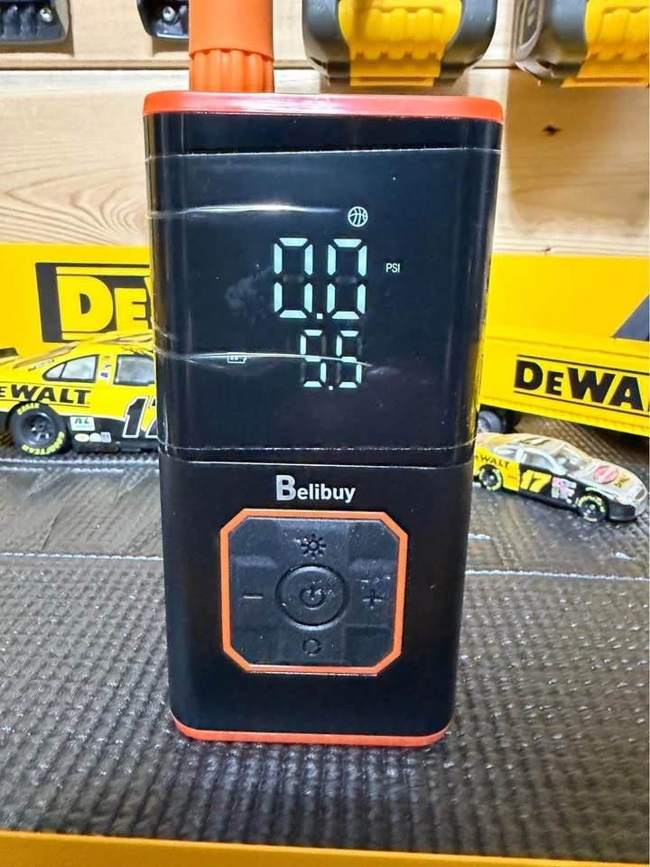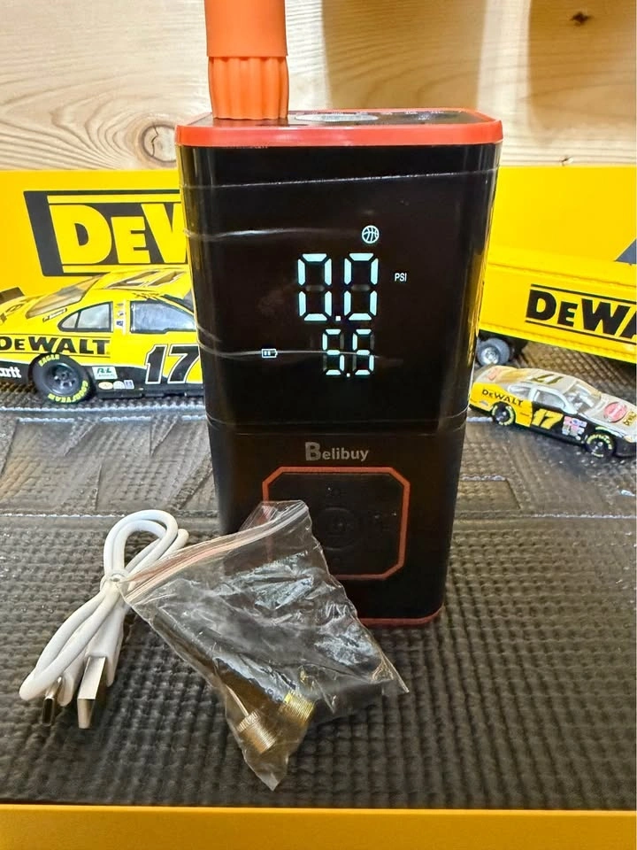 Brand new Belibuy handheld rechargeable compressor with a built-in flashlight, perfect for inflating tires and other inflatables on the go. It features a digital display, preset modes, and various accessories. It's compact, portable, and ready to use.