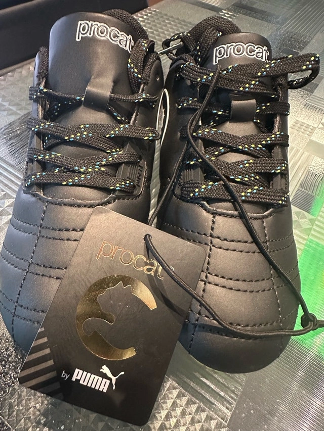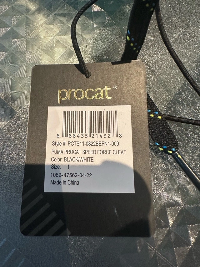 These Puma Procat Speed Force Cleats are brand new with tags and are perfect for the soccer enthusiast looking for high-quality footwear. The black and white design is sleek, and the cleats offer excellent traction on the field. Youth size 1. From a pet and smoke-free home.